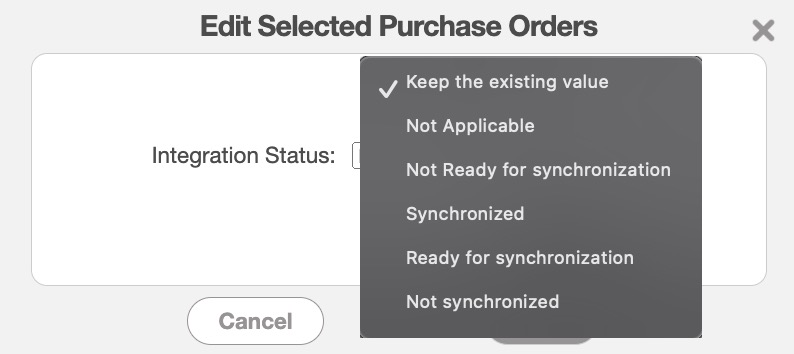 Click on the More Actions button and from the drop-down select the "Edit Selected Purchase Orders Integration Status" option: