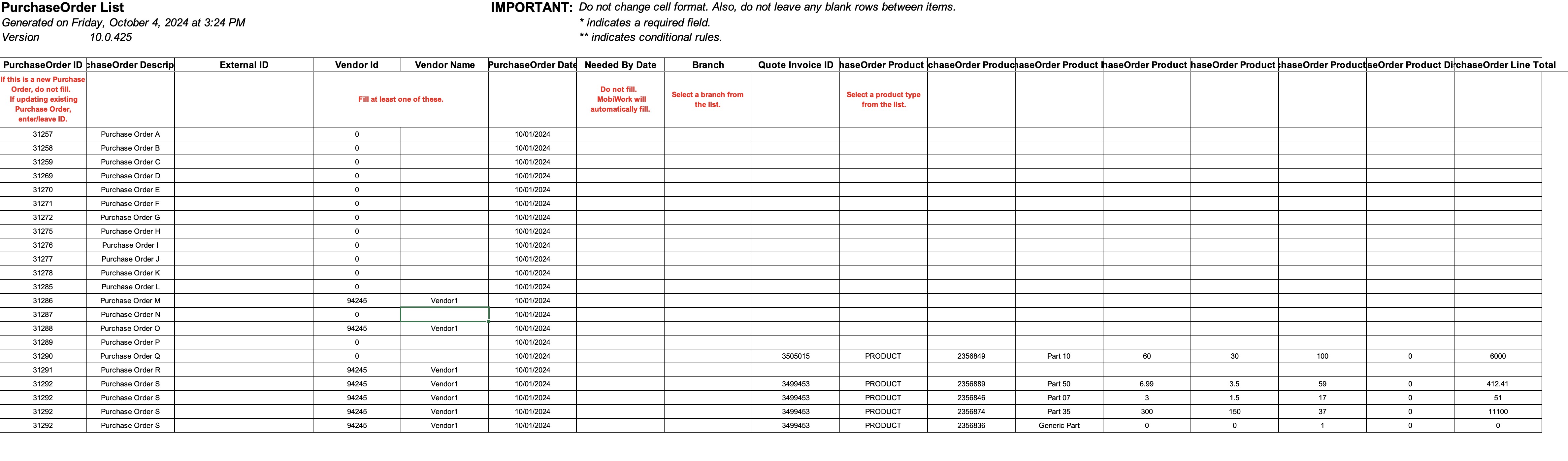 Once you are done updating your purchase orders, you can import the Excel file back into MobiWork. For more information on how to import purchase orders, please see the Import and Export Purchase Orders page.