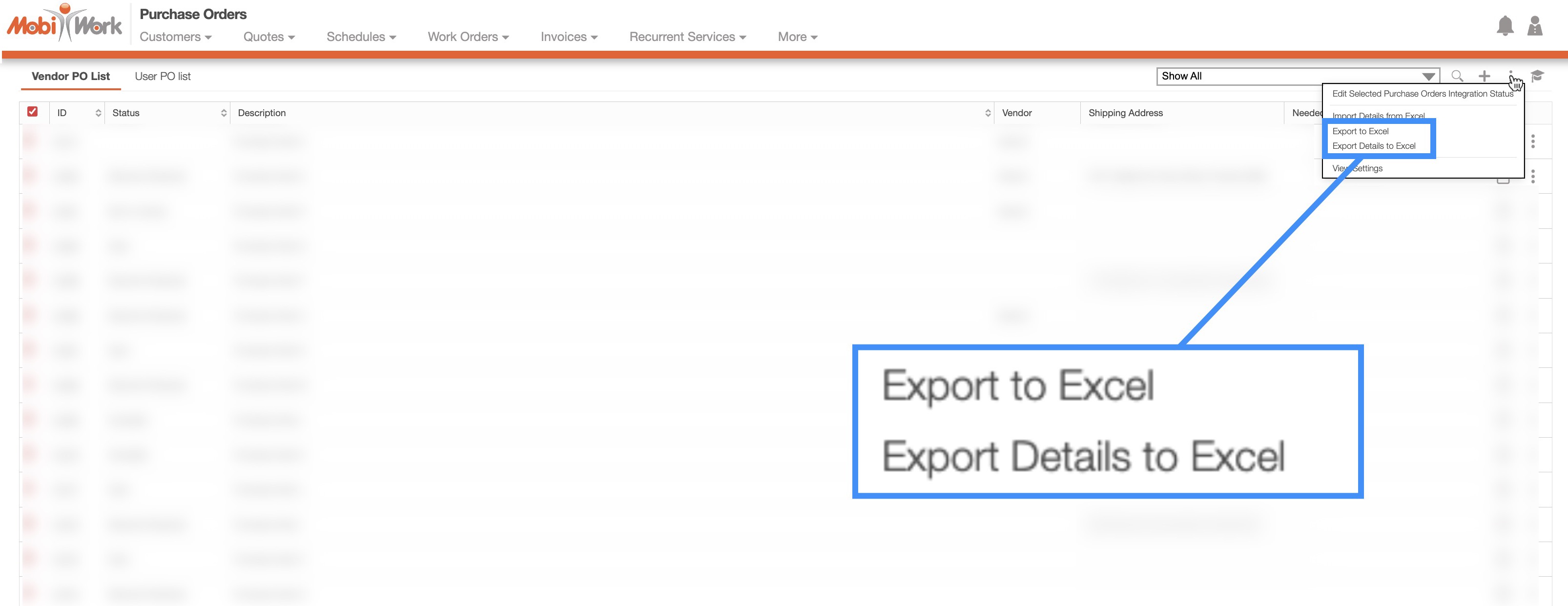 First, you would need to select the desired purchase orders and use the "Export Details to Excel" option. For more information on how to export work orders please see the Import and Export Purchase Orders page: