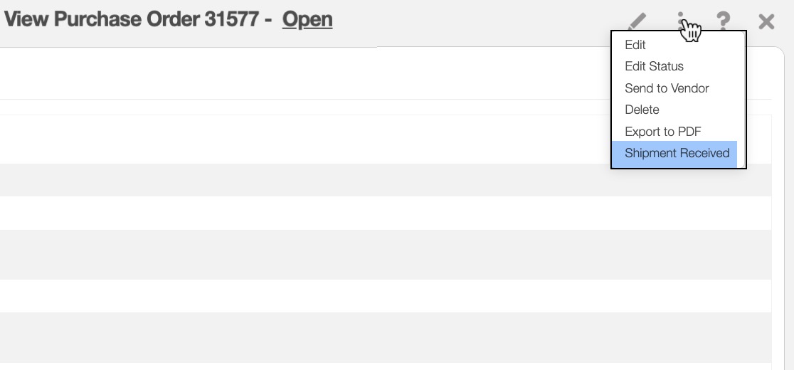 You will be able to perform these actions from the View Purchase Order pop-up window by clicking on the Individual Actions button and selecting the "Shipment Received" option from the drop-down: