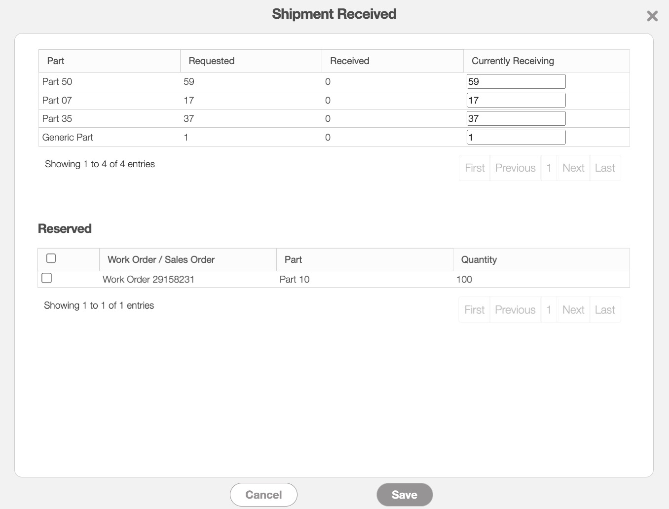 In this pop-up window you will be able to input the quantity of the parts being received: