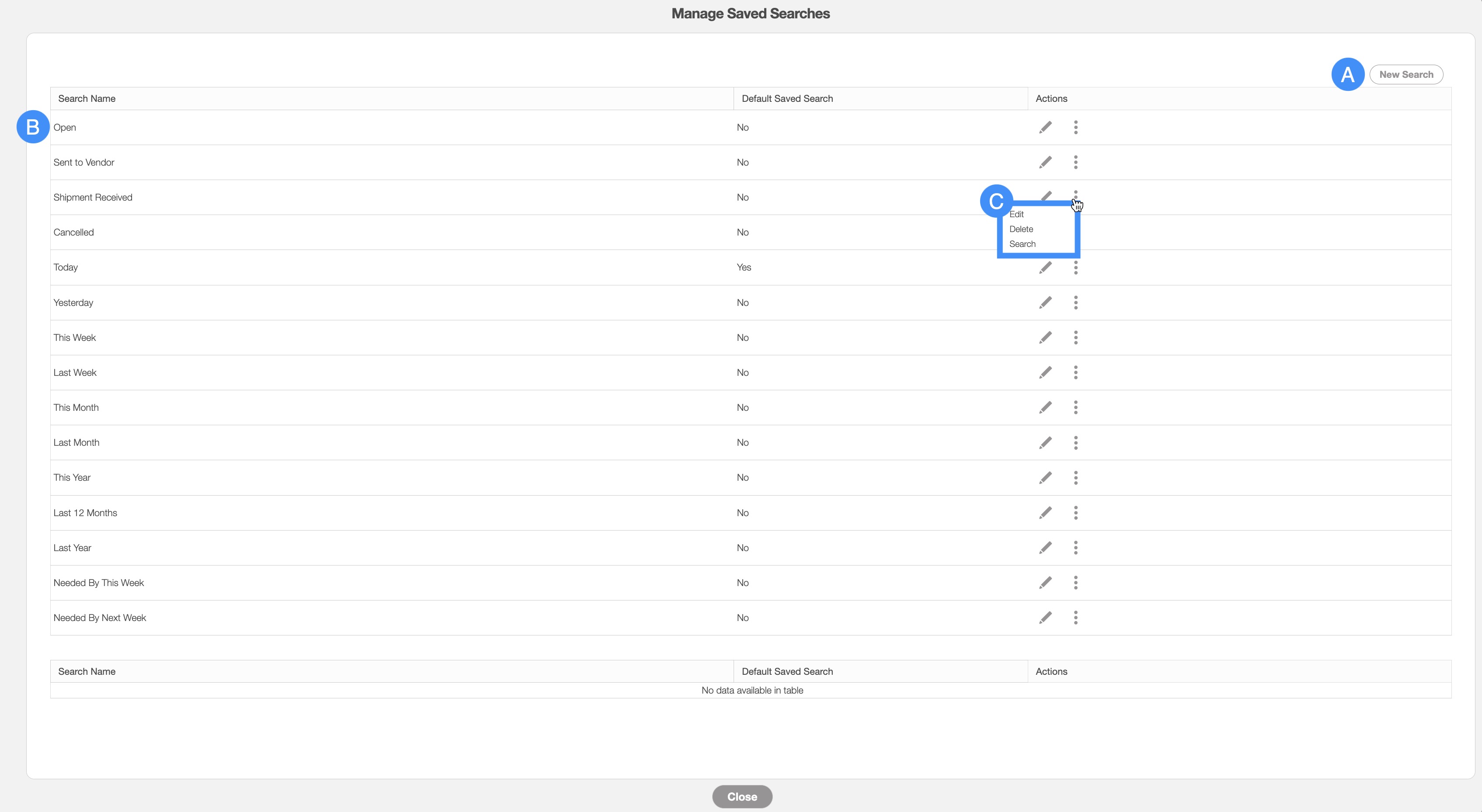 To manage, edit, or remove any Saved Searches you can access the "Manage Saved Searches" option in the drop-down menu; the Manage Saved Searches pop-up window will then appear: