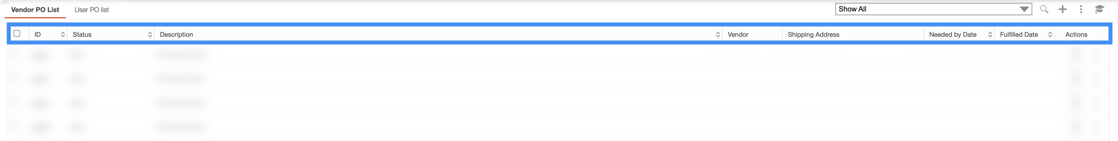 These columns are organized as: "ID," "Status," "Description," "Vendor," "Shipping Address," "Needed by Date," "Fulfilled Date," and "Actions:"