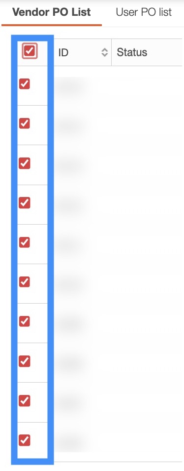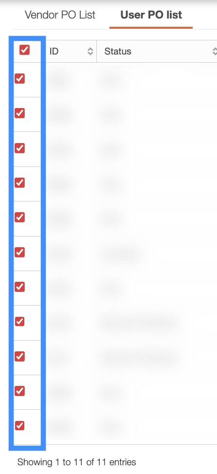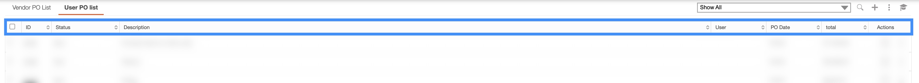 The "User PO List" tab will display your purchase orders' ID, the status of the purchase order, the user, and more: