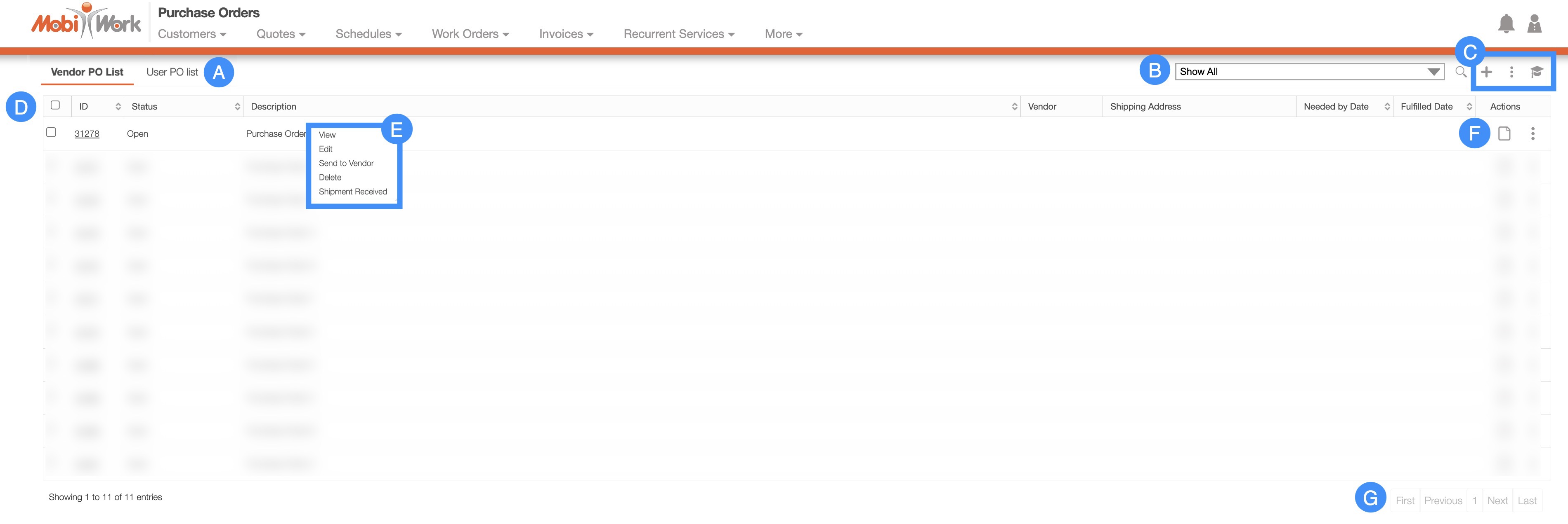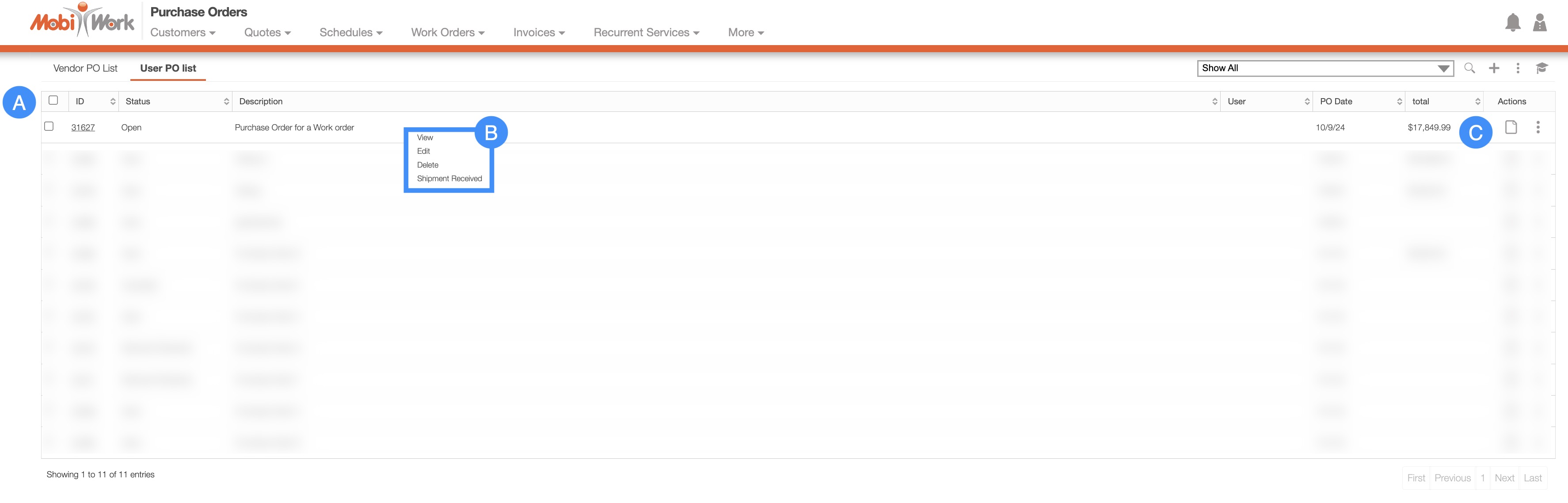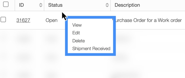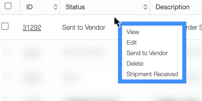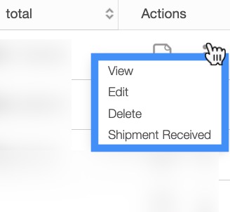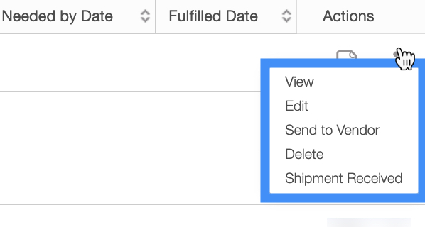 When selecting a purchase order and clicking on the Individual Actions button (the three vertical dots under the "Actions" column) you will be able to view, edit, and more to the selected purchase order.