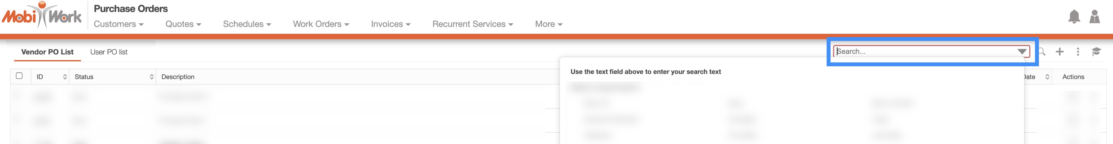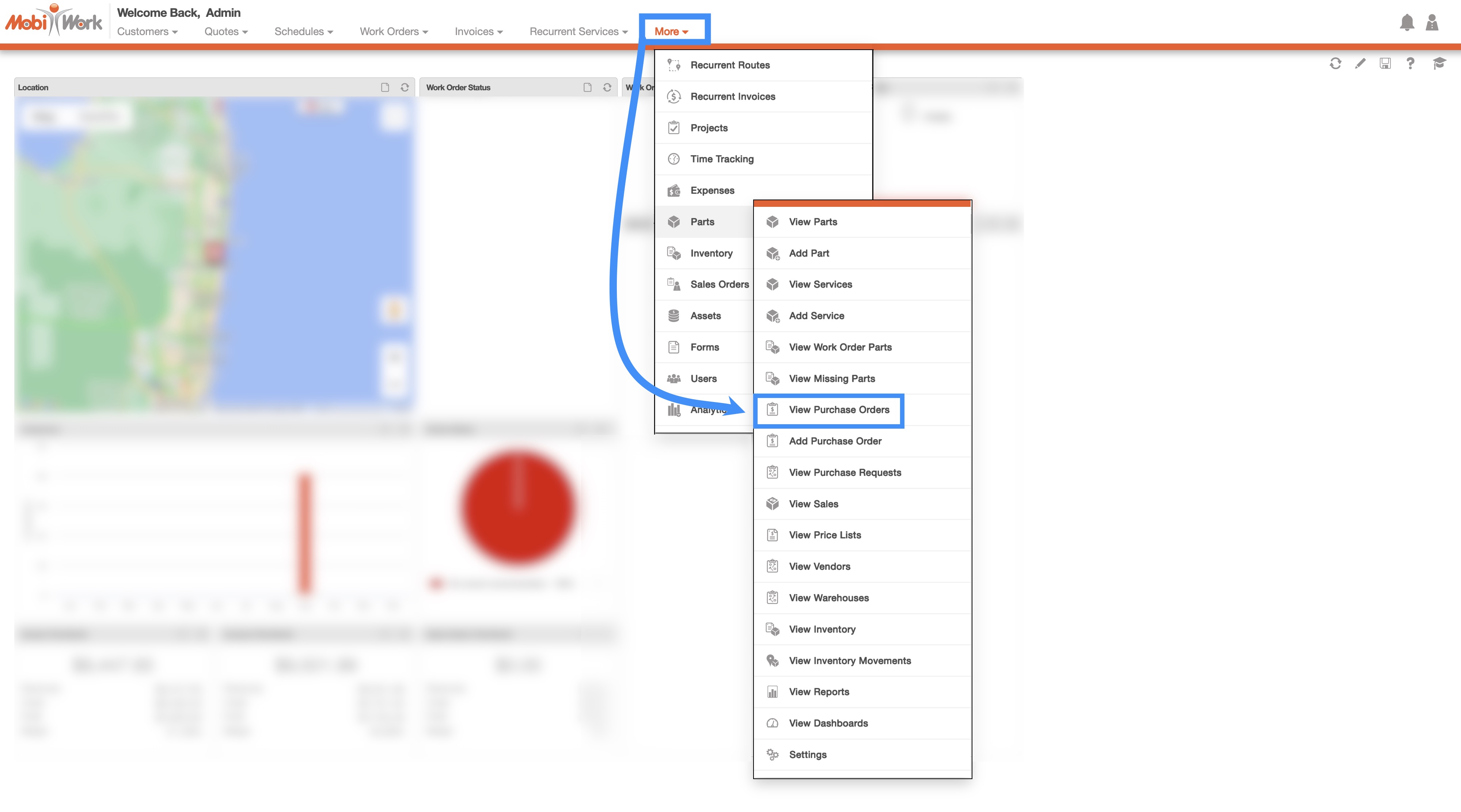 You can access the Purchase Orders feature page by hovering over the Parts feature from your MobiWork menu; from the drop-down that appears click on the "View Purchase Orders" option: