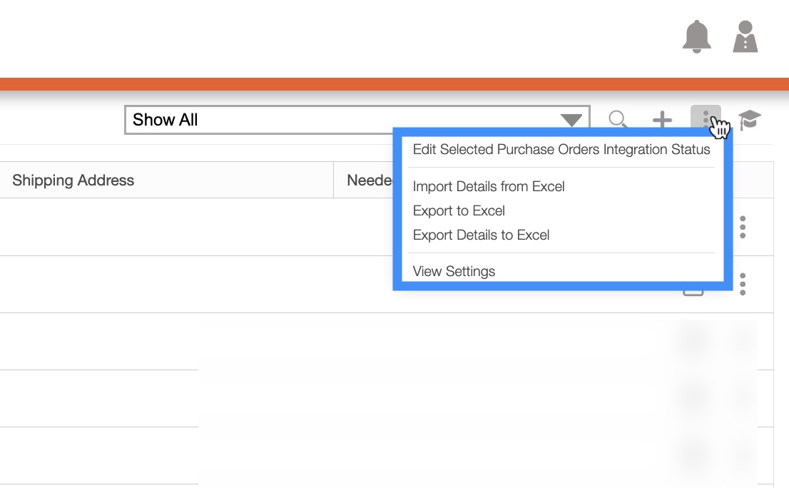 The More Actions button (represented by the three vertical dots) which will allow you to edit selected purchase orders or import/export the purchase orders to and from Excel.