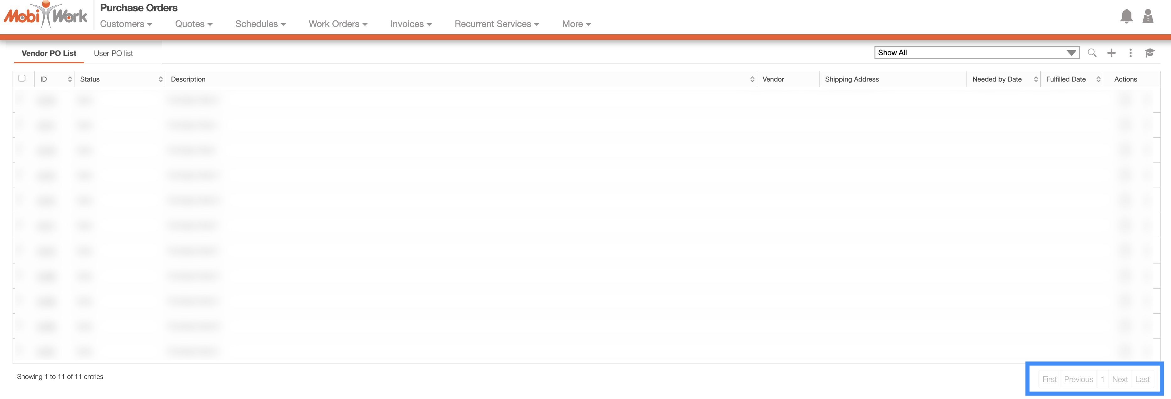 To navigate through these pages, use the First, Previous, Next, and Last buttons located towards the bottom of the Purchase Orders section.