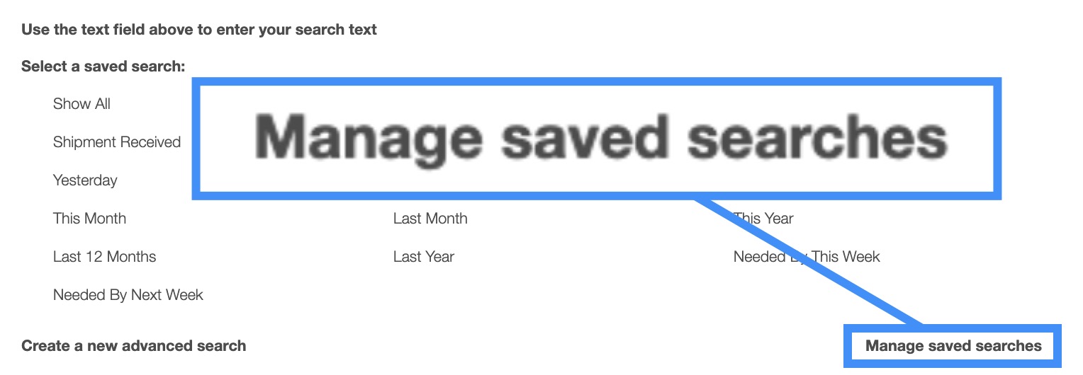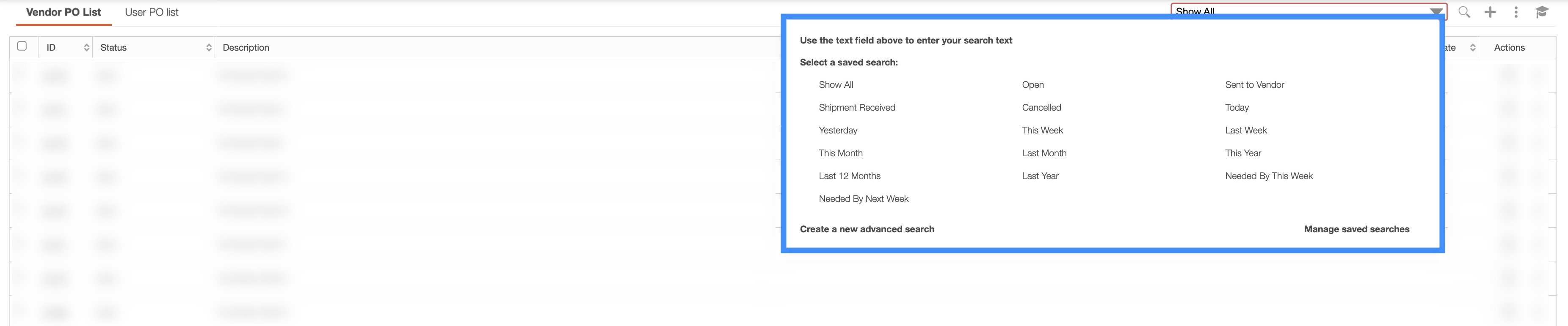 Saved searches are a powerful search tool where the search-criteria has been saved for future use; to access the saved searches drop-down, click in the search bar. The default saved search for Purchase Orders is the "Today" search.