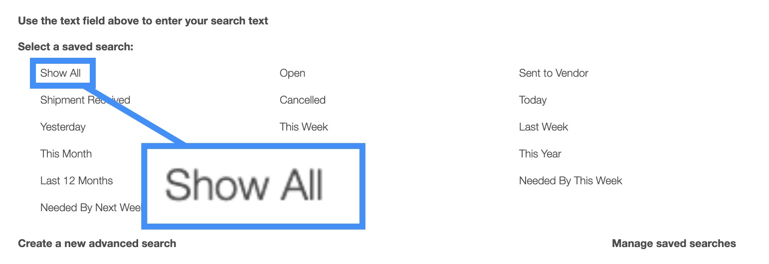 If you would like to view all your purchase orders, click on the "Show All" option from the drop-down menu: