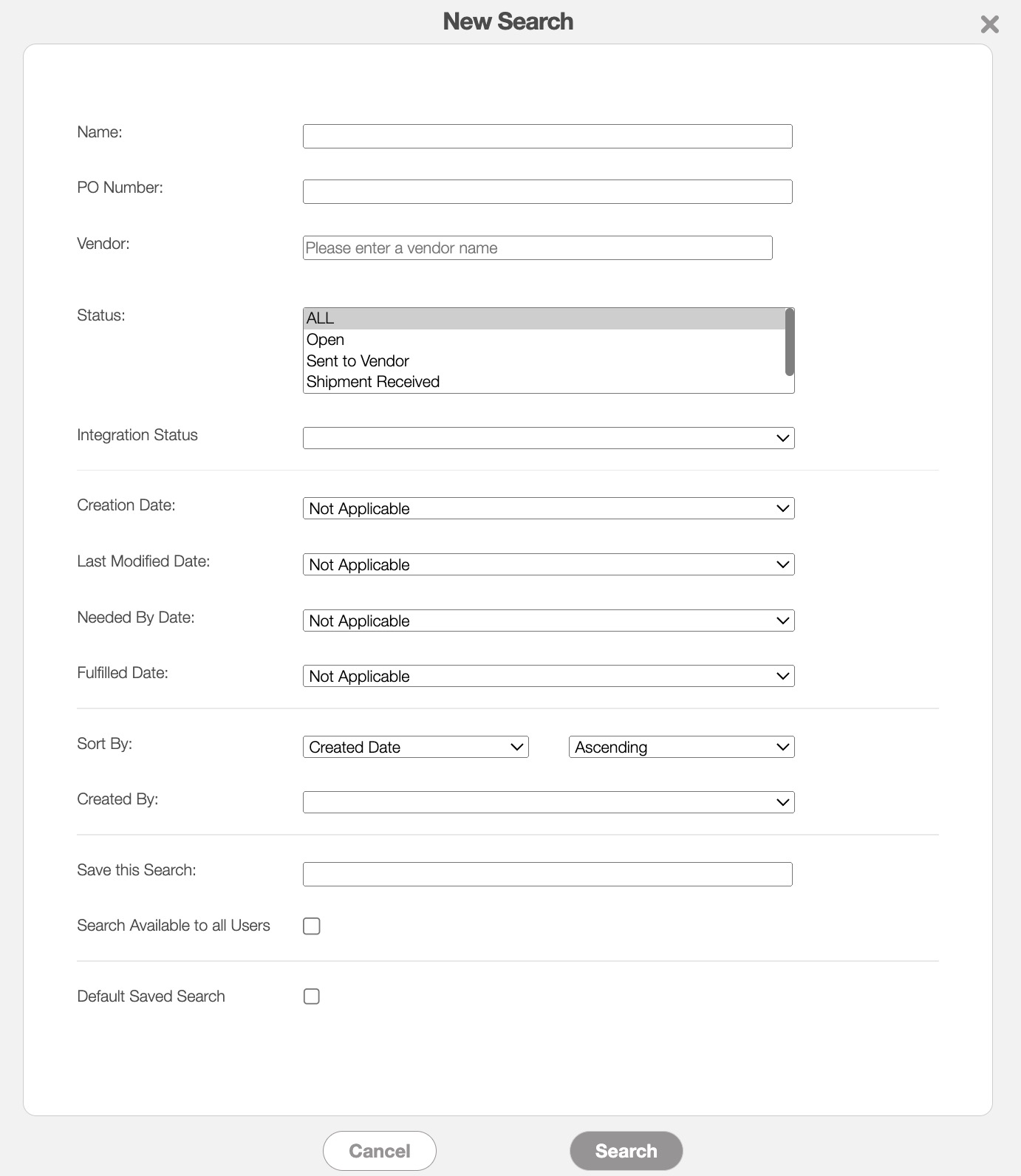 | "Sort By" | Sorts your search in ascending or descending order by: Created Date, ID, PO Number, Name, and Status. |