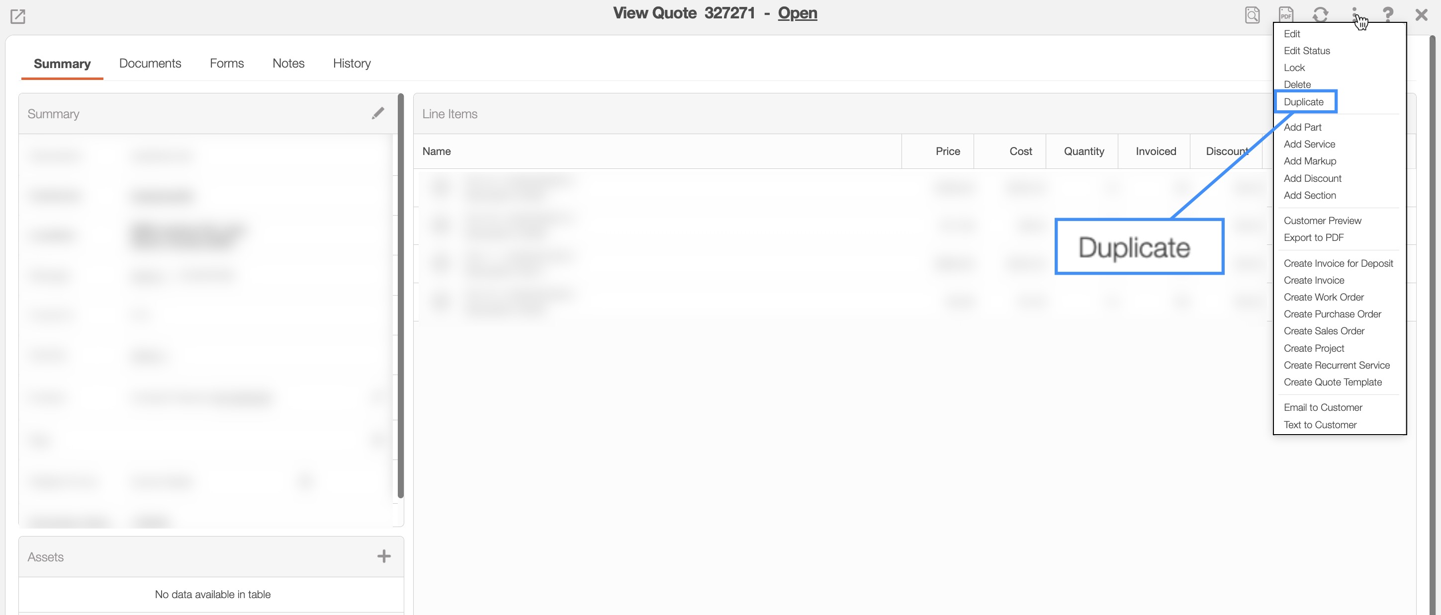 The example below shows how to access the "Duplicate" option from the View Quote pop-up window: