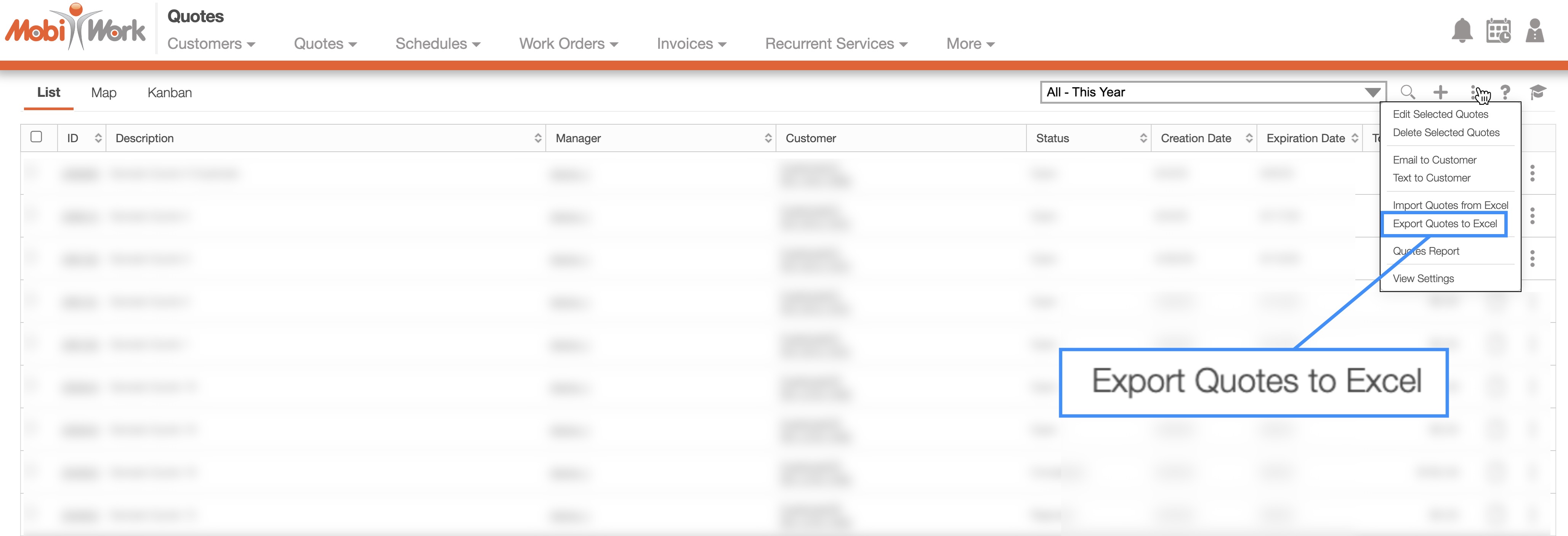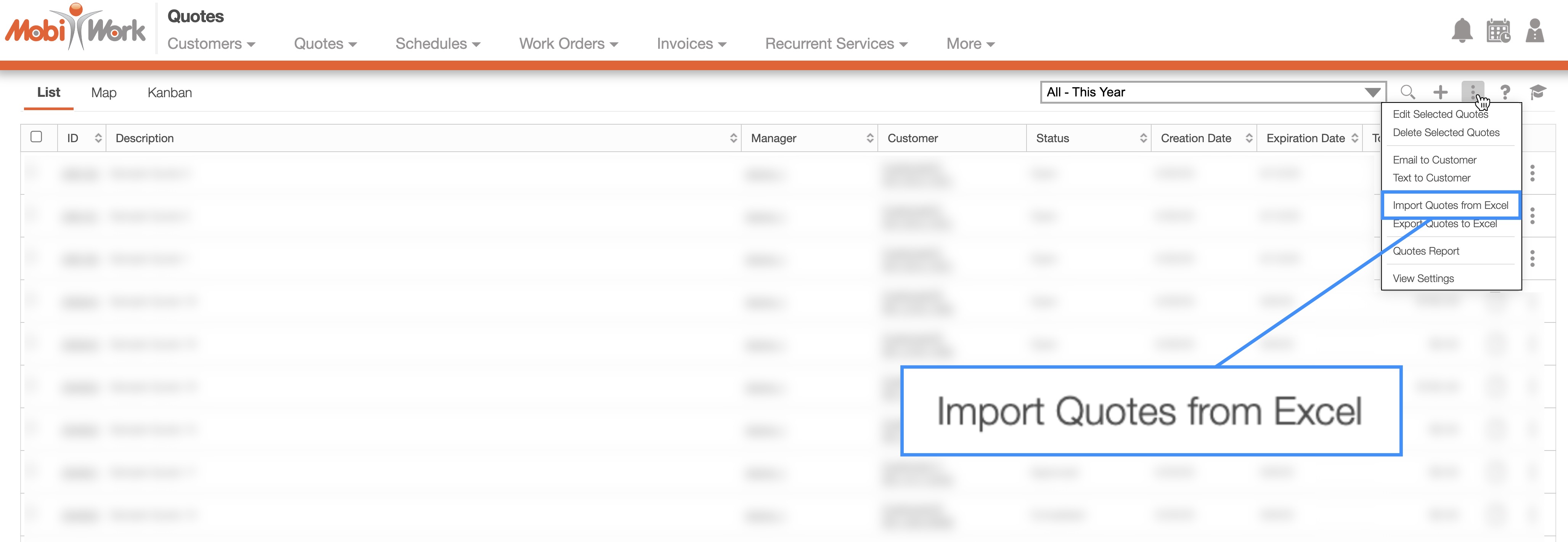 Once you are done updating your quotes, you can import the Excel file back into MobiWork. You can accomplish this by selecting the "Import Quotes from Excel" option from the More Actions drop-down on the "List" tab. For more information on how to import quotes, please see the Add Quote page:
