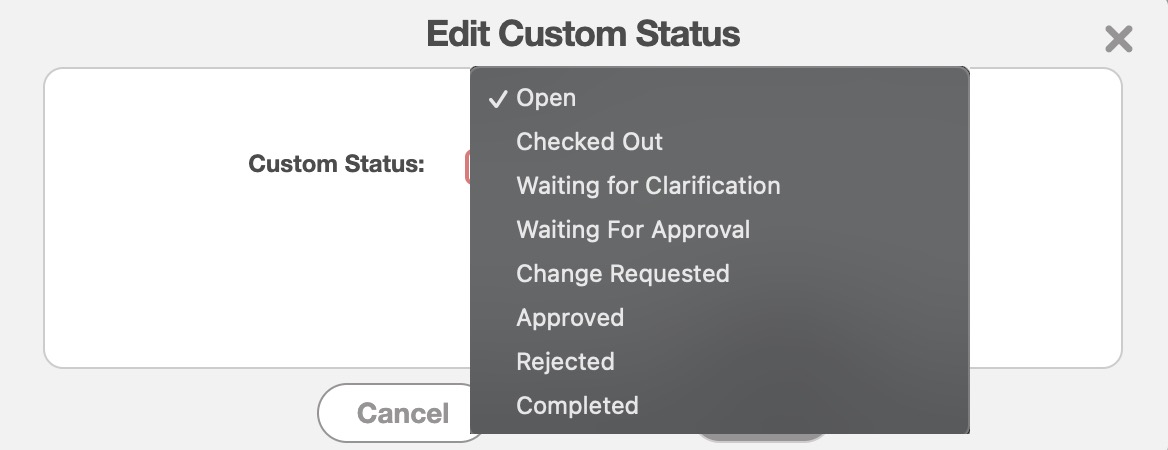 Regardless, of how you decide to update the status, the Edit Custom Status pop-up window will appear. In this window, select the new status and then click the Save button: