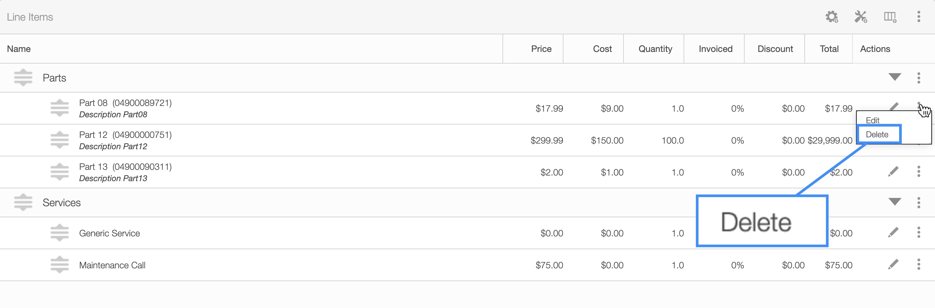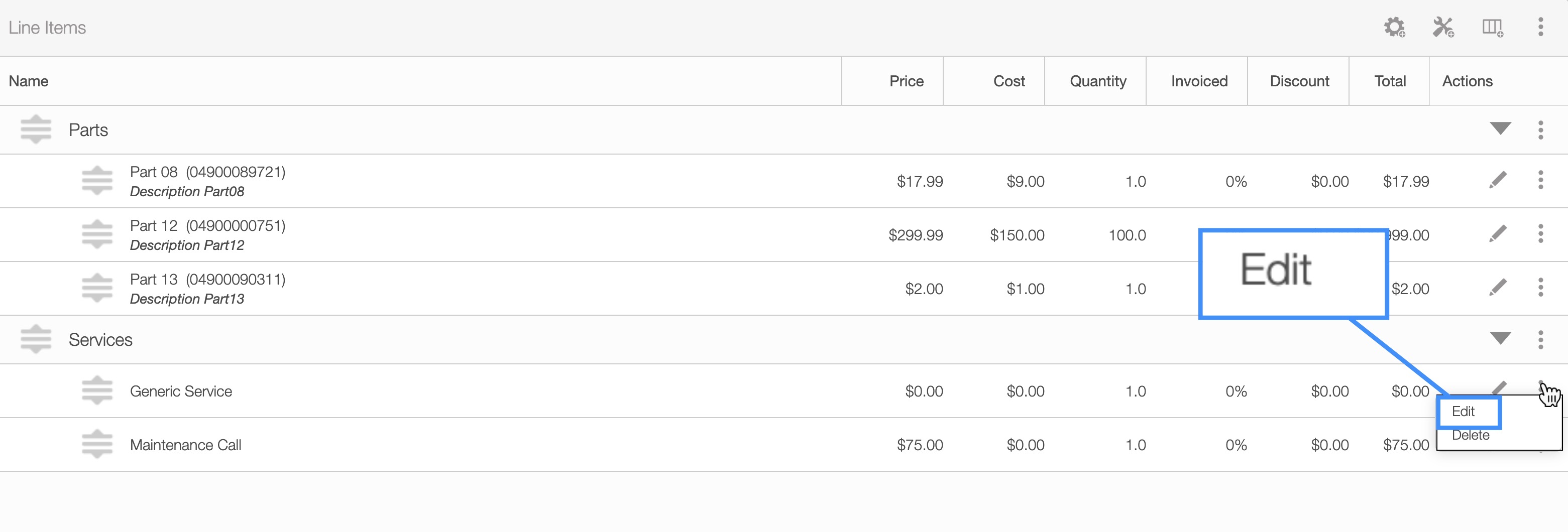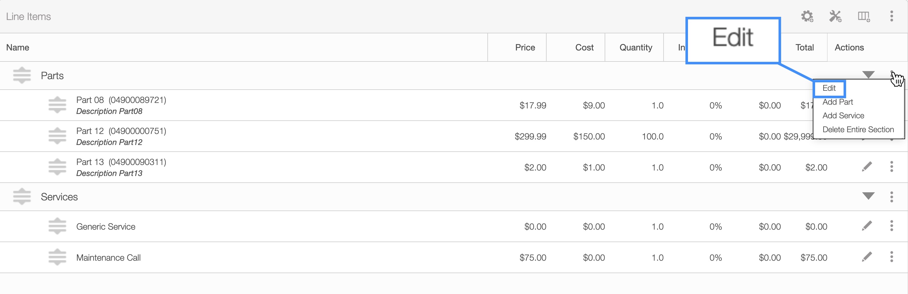 You will be able to edit the parts, services, and sections listed in the quote's line items. The following subsections will illustrate how to edit these different line item entries.