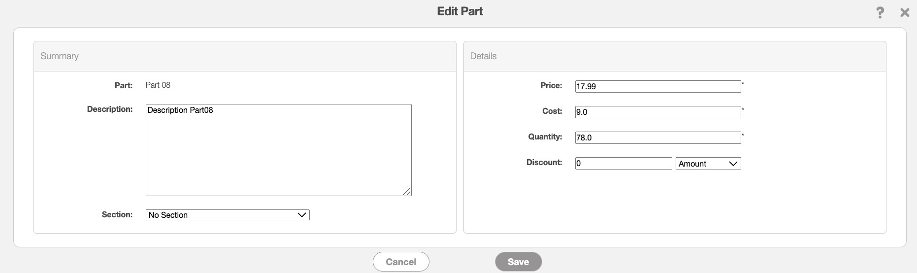 Once you click on the "Edit" option or the Pencil icon, the Edit Part pop-up window will appear: