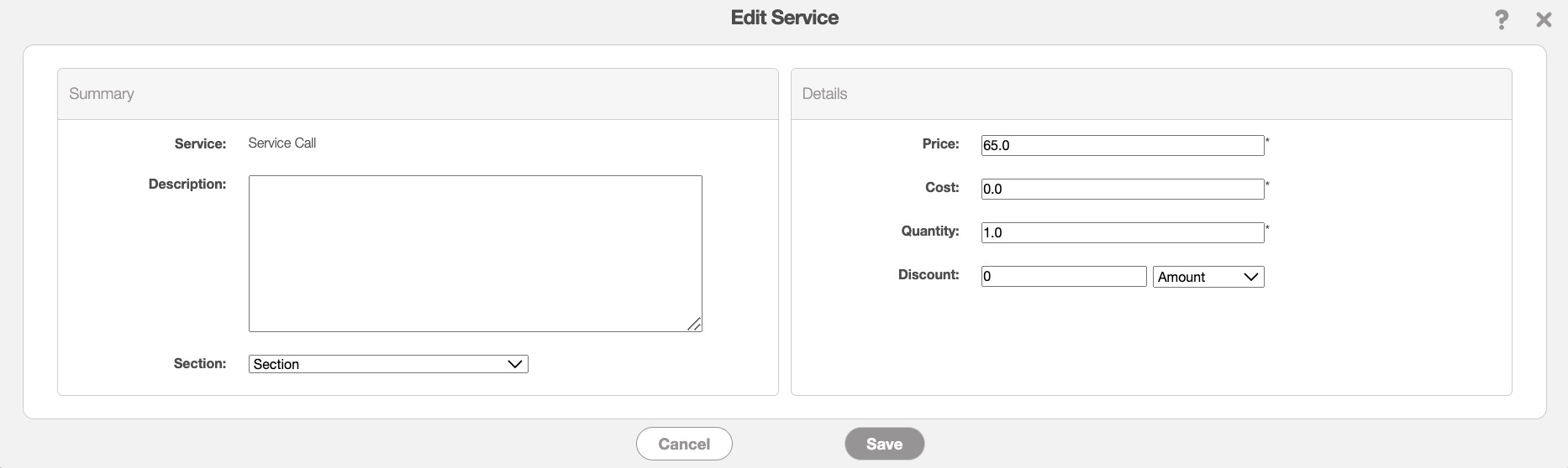 Price and Cost- These fields will be automatically filled based on the saved data you have in your services catalog; however, you can directly edit the price and cost. For more information about your services catalog, please see the Services Catalog (list) page.