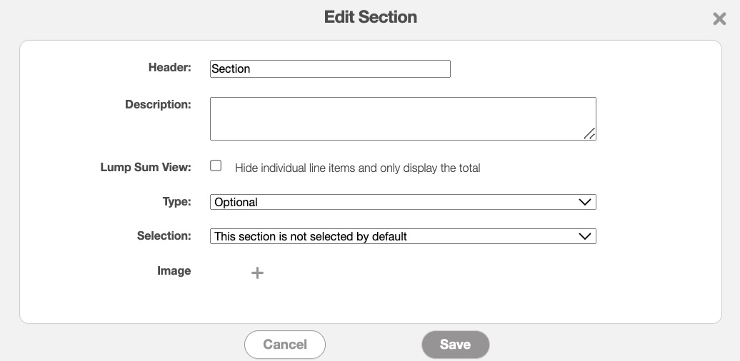 Type- The type drop-down indicates the category (i.e., Required, Optional, Alternate) to which the section, along with its corresponding parts and services, belongs. Optional or Alternate sections allow customers to select the options they prefer from the emailed quote. This is especially helpful for Good, Better, Best estimates.