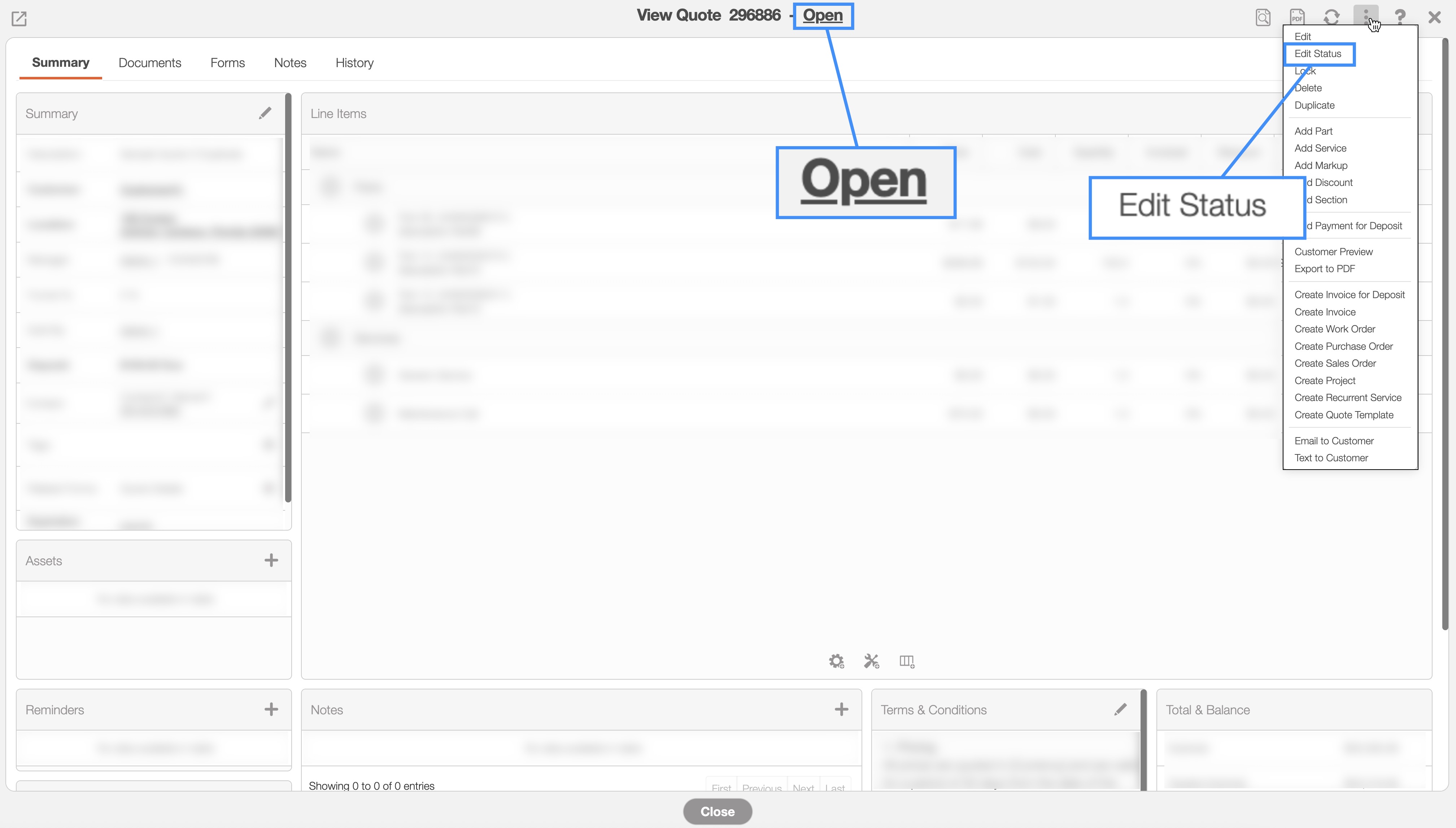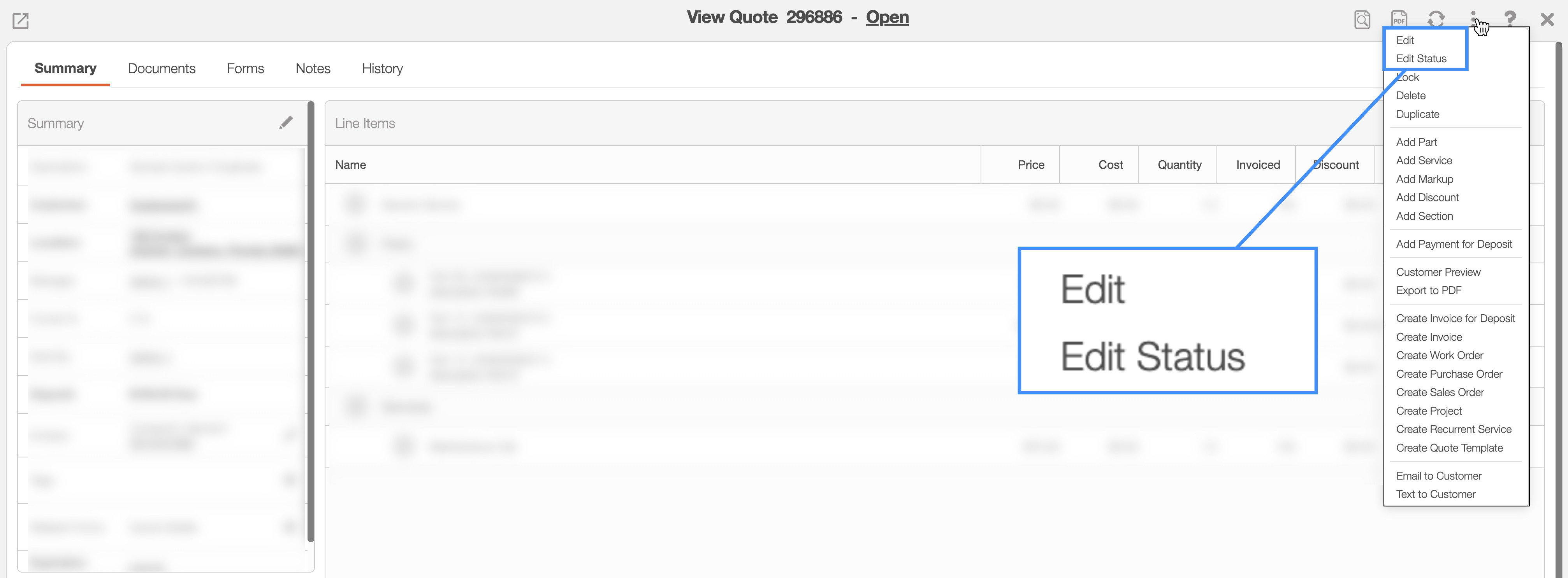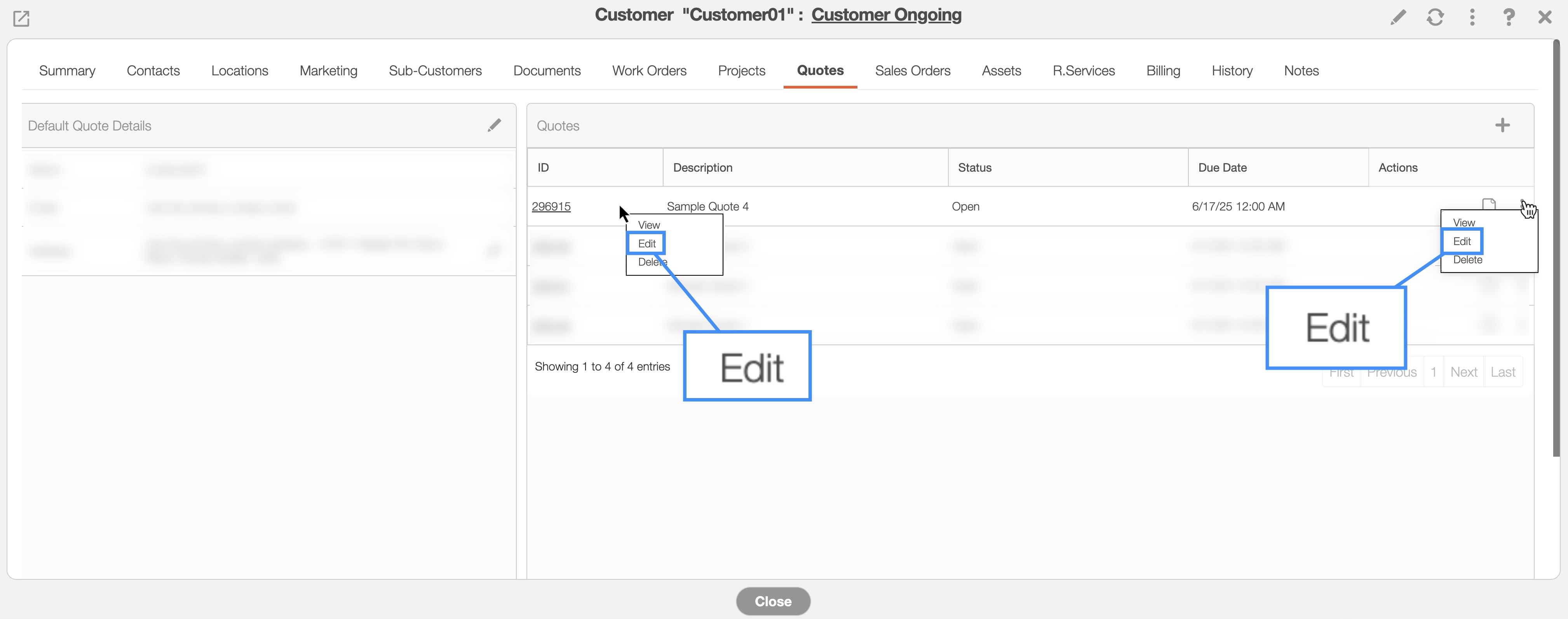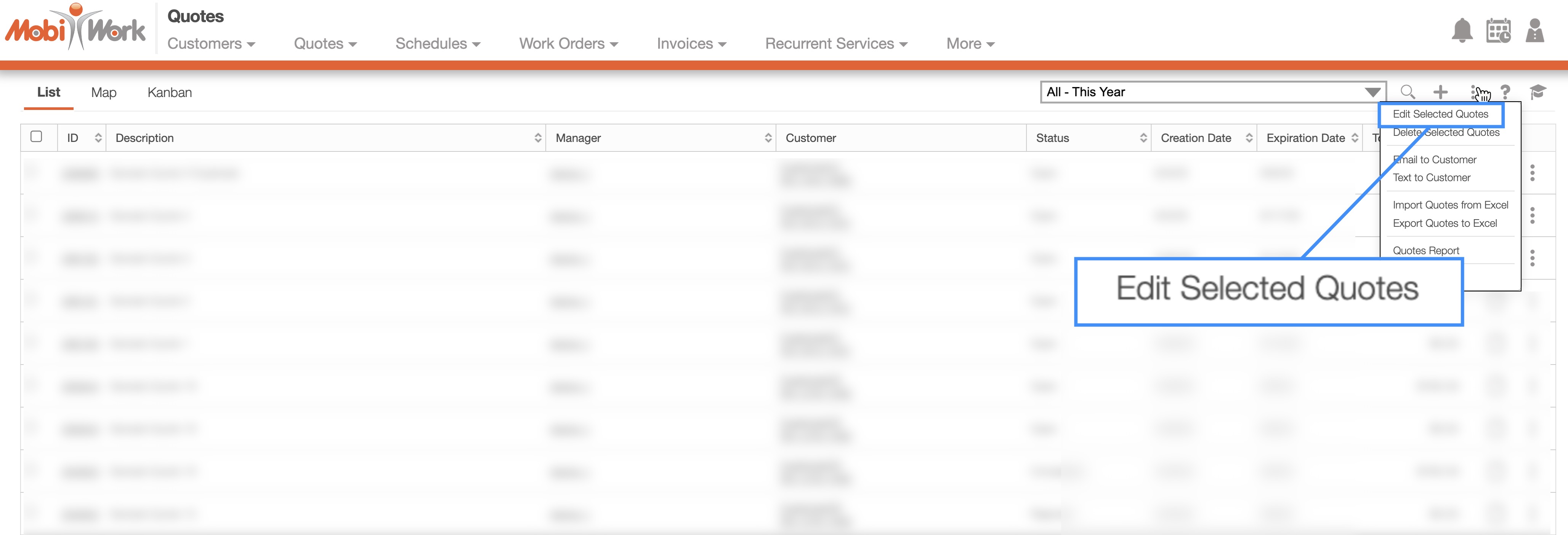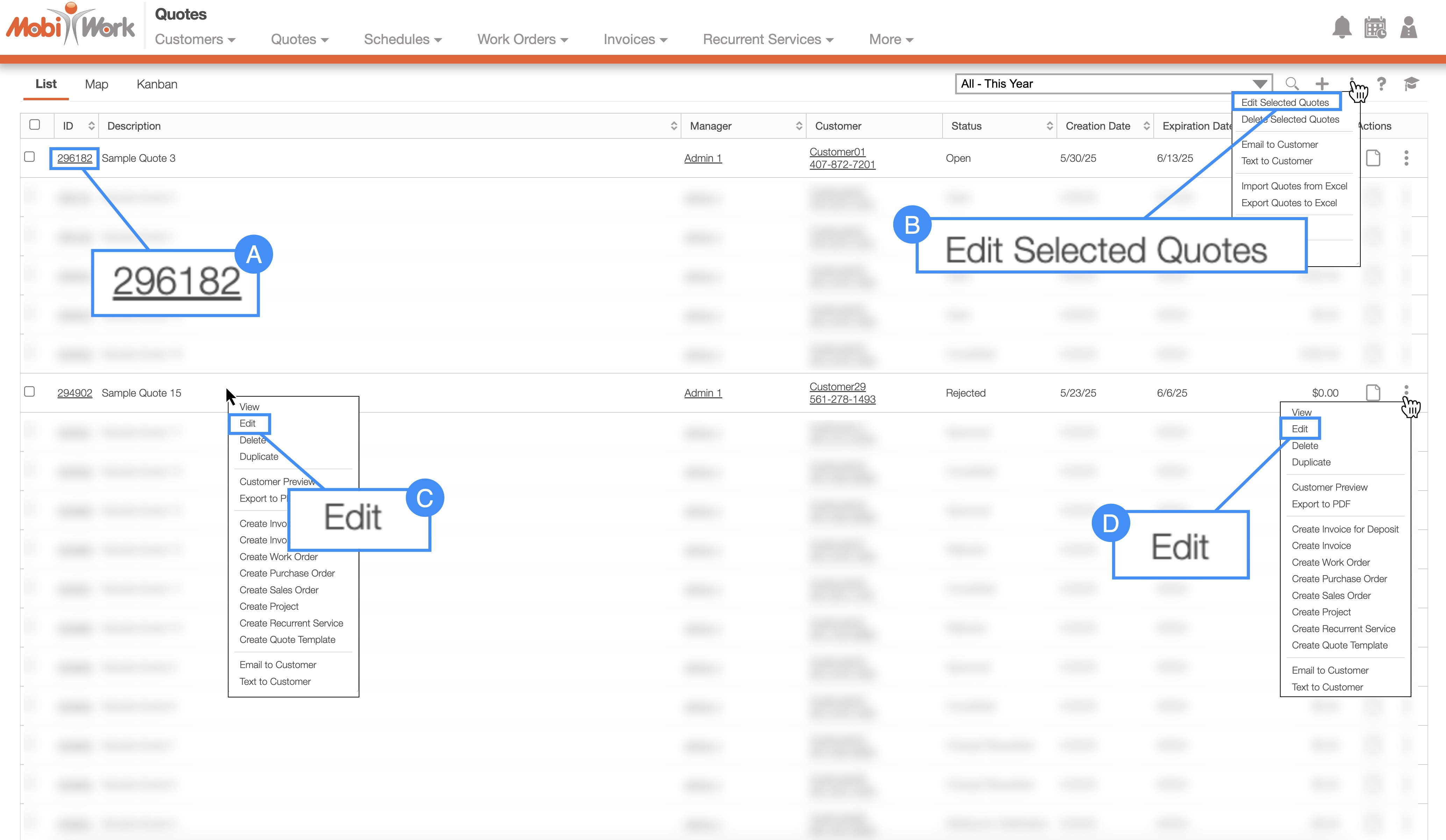 There are several ways you can edit a quote within MobiWork. You can edit the quote either through the Quote feature page or through the View Customer pop-up window. The subsections below will go over some common methods of editing quotes.