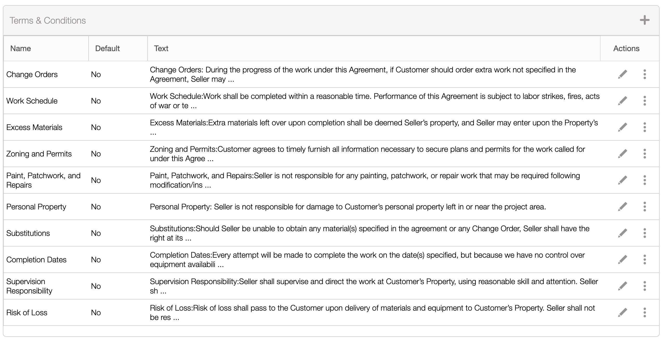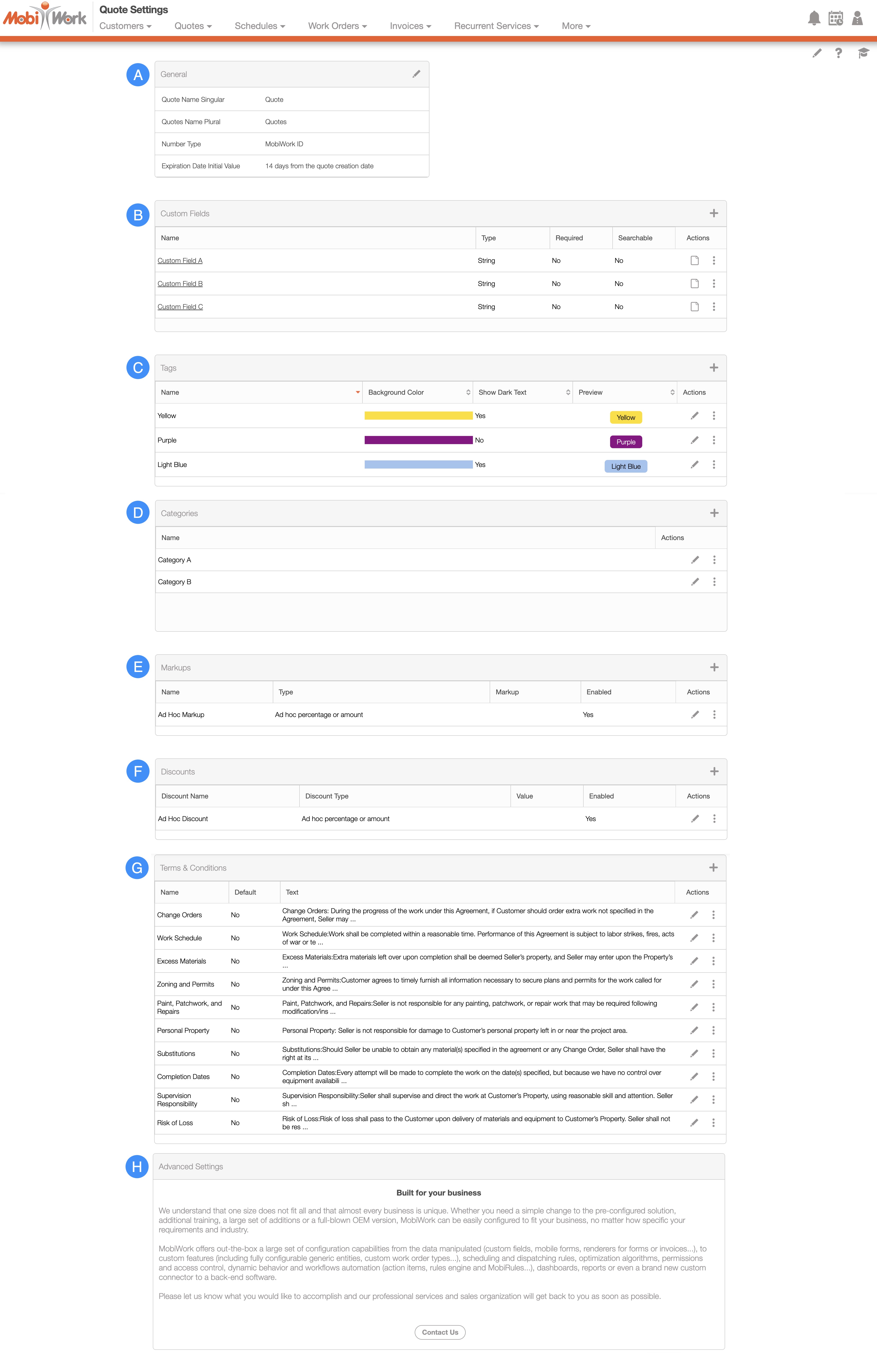 Unlock the power of the Quote Settings page, putting you in charge of your quote management. Easily add or edit quote categories, color-coded tags, fine-tune custom fields, and effortlessly add discounts or markups that can be applied to your quotes. You can create terms and conditions templates that can be effortlessly applied to your quotes time and again.