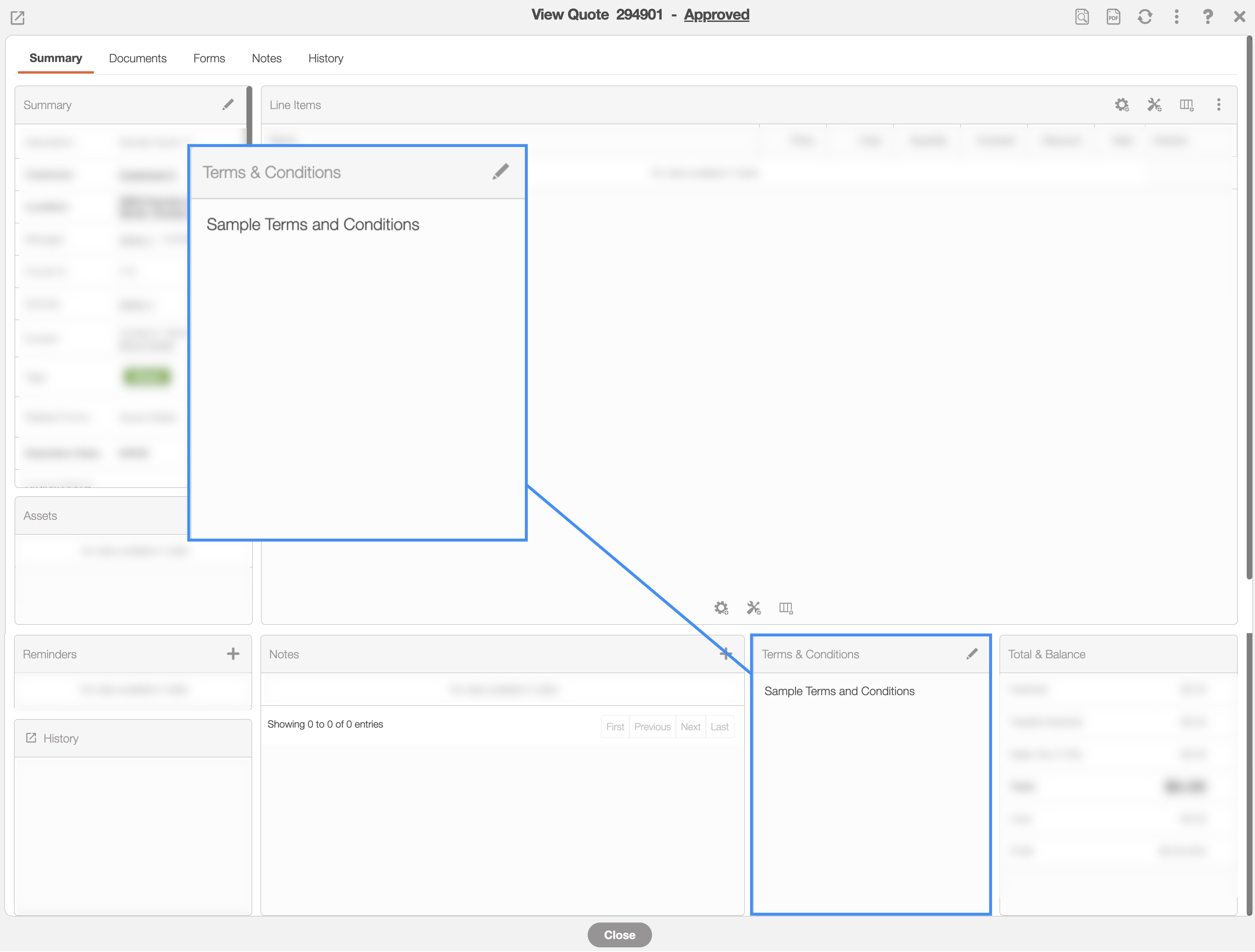 After you added your terms and conditions on the Settings page, you will be able to access them on the "Summary" tab of the View Quote pop-up window:
