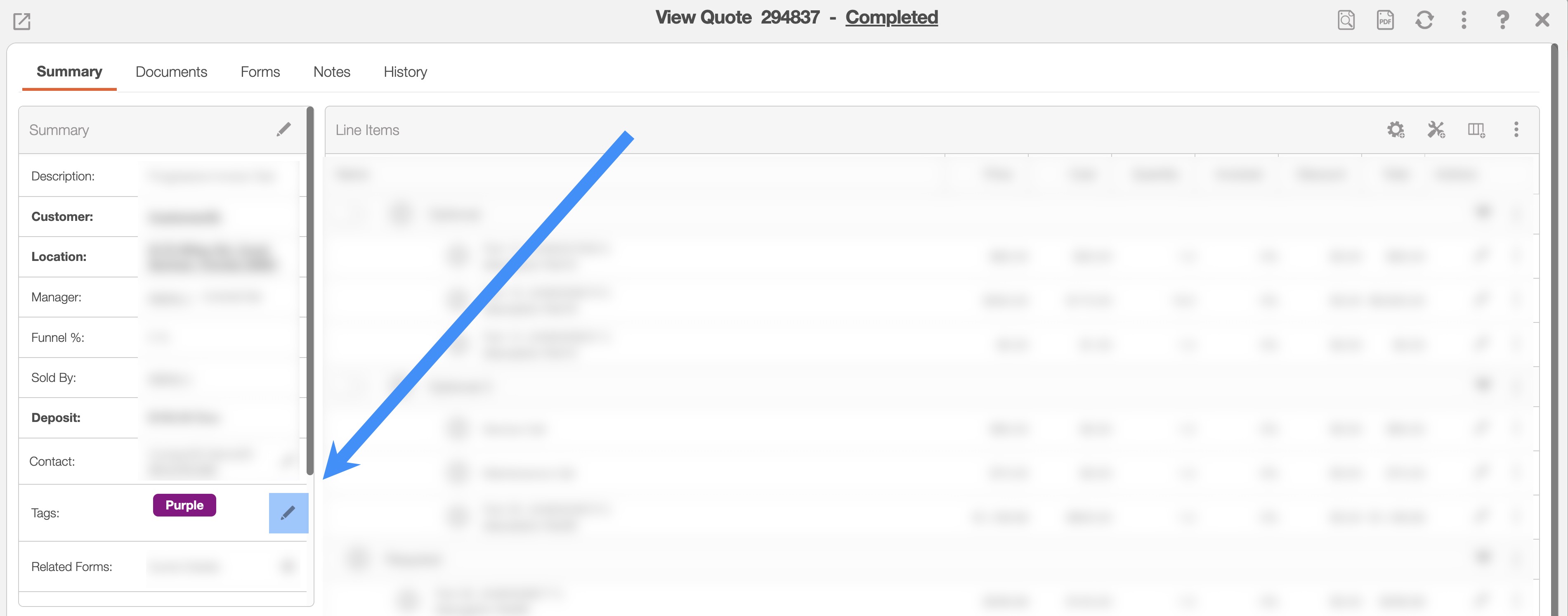 To add a new tag to your quote, open the View Quote pop-up window and in the "Summary" panel click on the Plus Sign for the "Tags" column; if you have already added tags to your quote, this icon will turn into a Pencil icon: