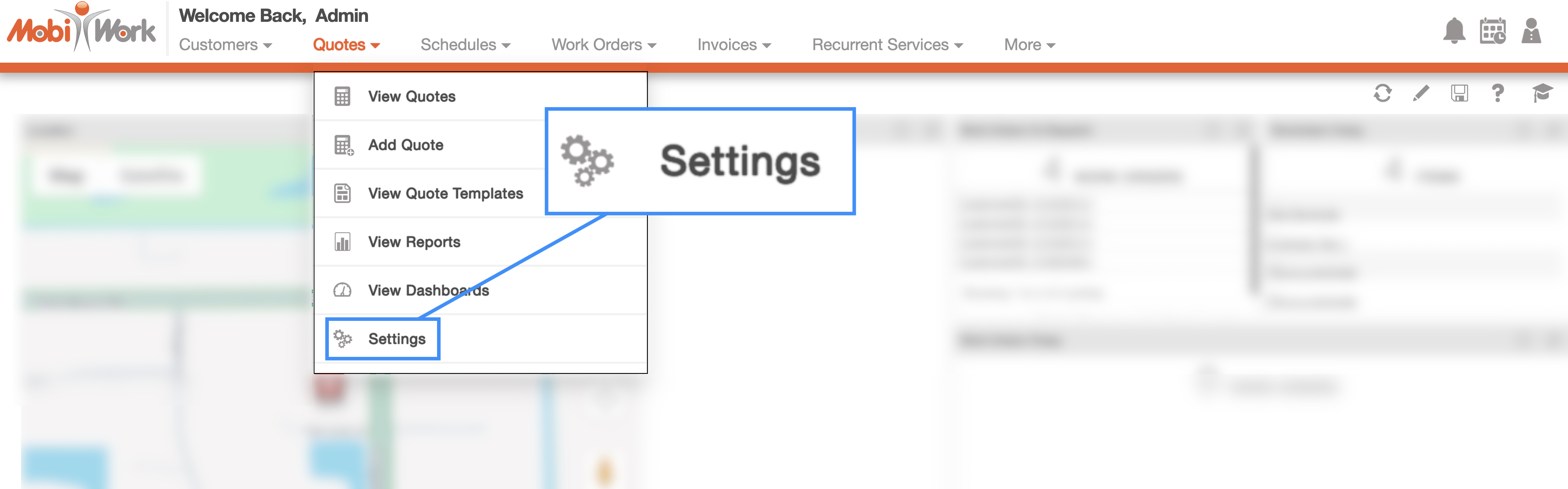 You can directly access the Settings page, by hovering over the Quote feature from your MobiWork menu, and clicking on the "Settings" option: