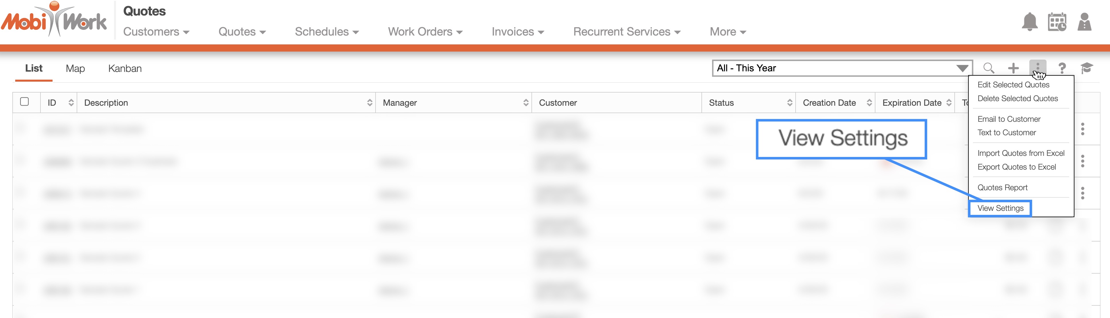 While you are on the Quotes feature page, you can also click on the More Actions button located at the top-right of your MobiWork web interface, and from the drop-down select the "Settings" option:
