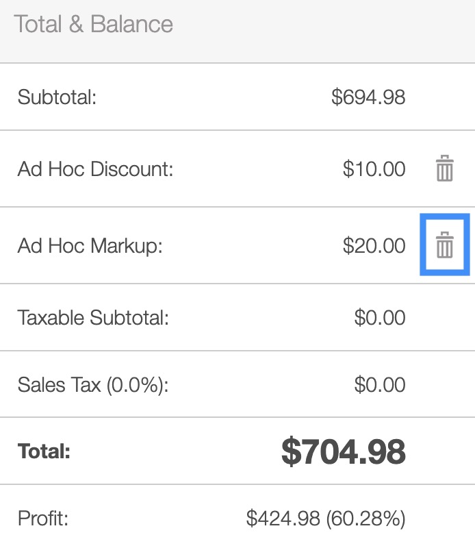 In the "Total & Balance" panel, locate the markup you would like to delete. Click on the corresponding Trash Can button next to the selected markup: