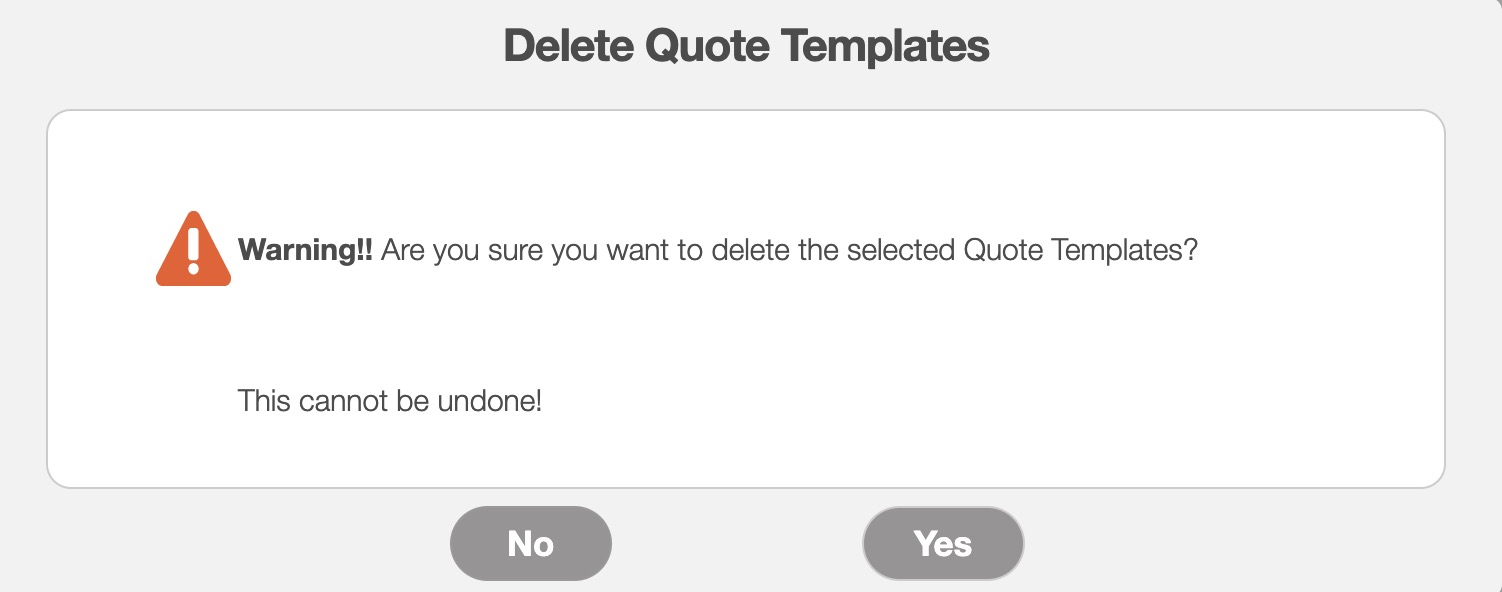 By choosing the "Delete Selected" quote template options you will receive the Delete Quote Templates pop-up window, informing you that this action cannot be undone: