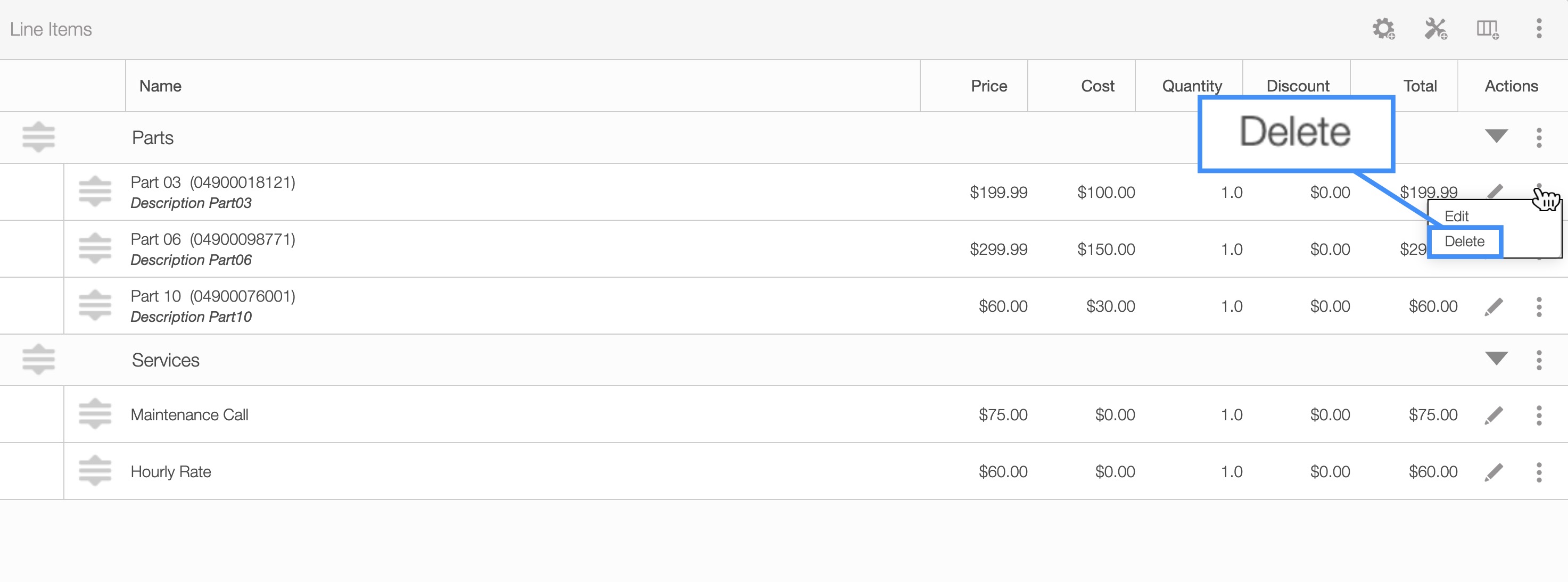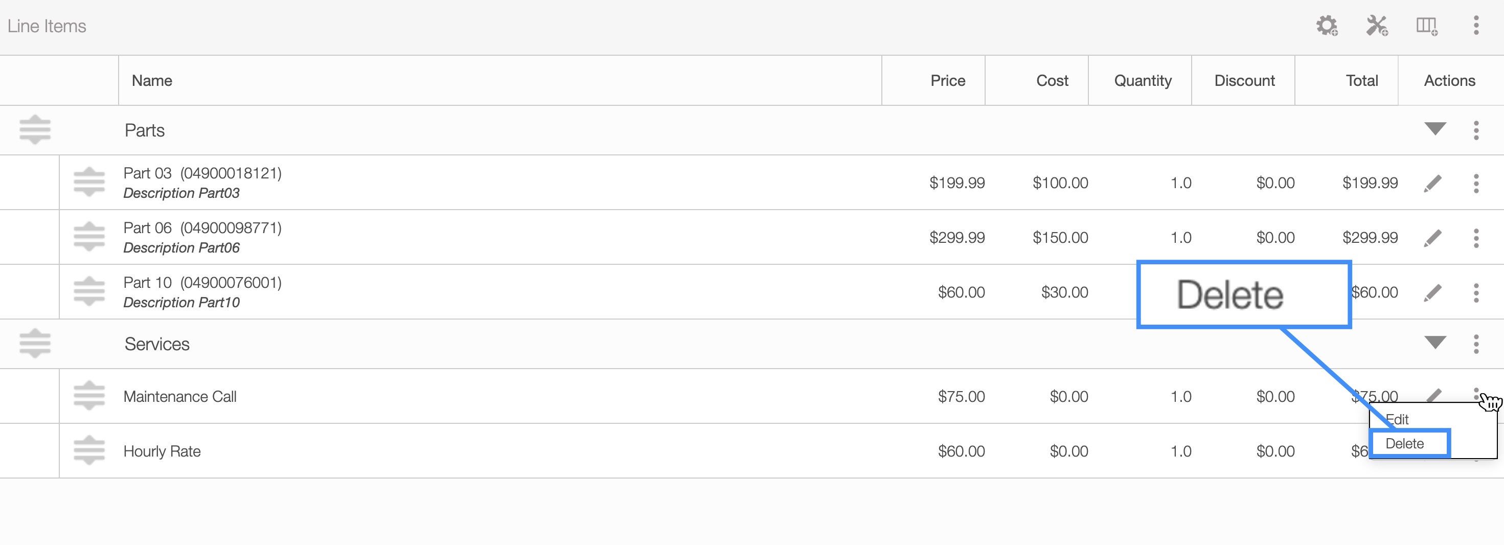 You will be able to delete the parts, services, sections, markups, and discounts listed in the quote's line items. The following subsections will illustrate how to delete these different line item entries.