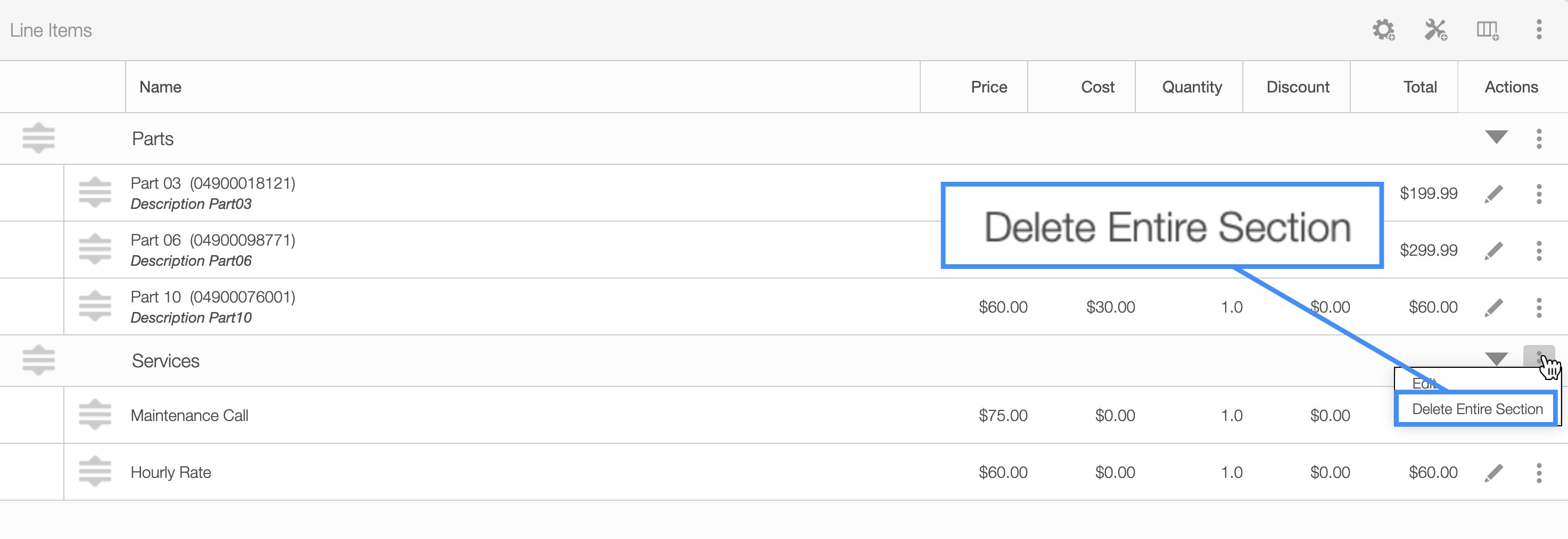In the "Line Items" panel click on the selected section's Individual Actions. From the Individual Actions' drop-down menu that appears, select the "Delete Entire Section" option. You can also delete the selected section by right-clicking on it and selecting the "Delete Entire Section" option from the drop-down: