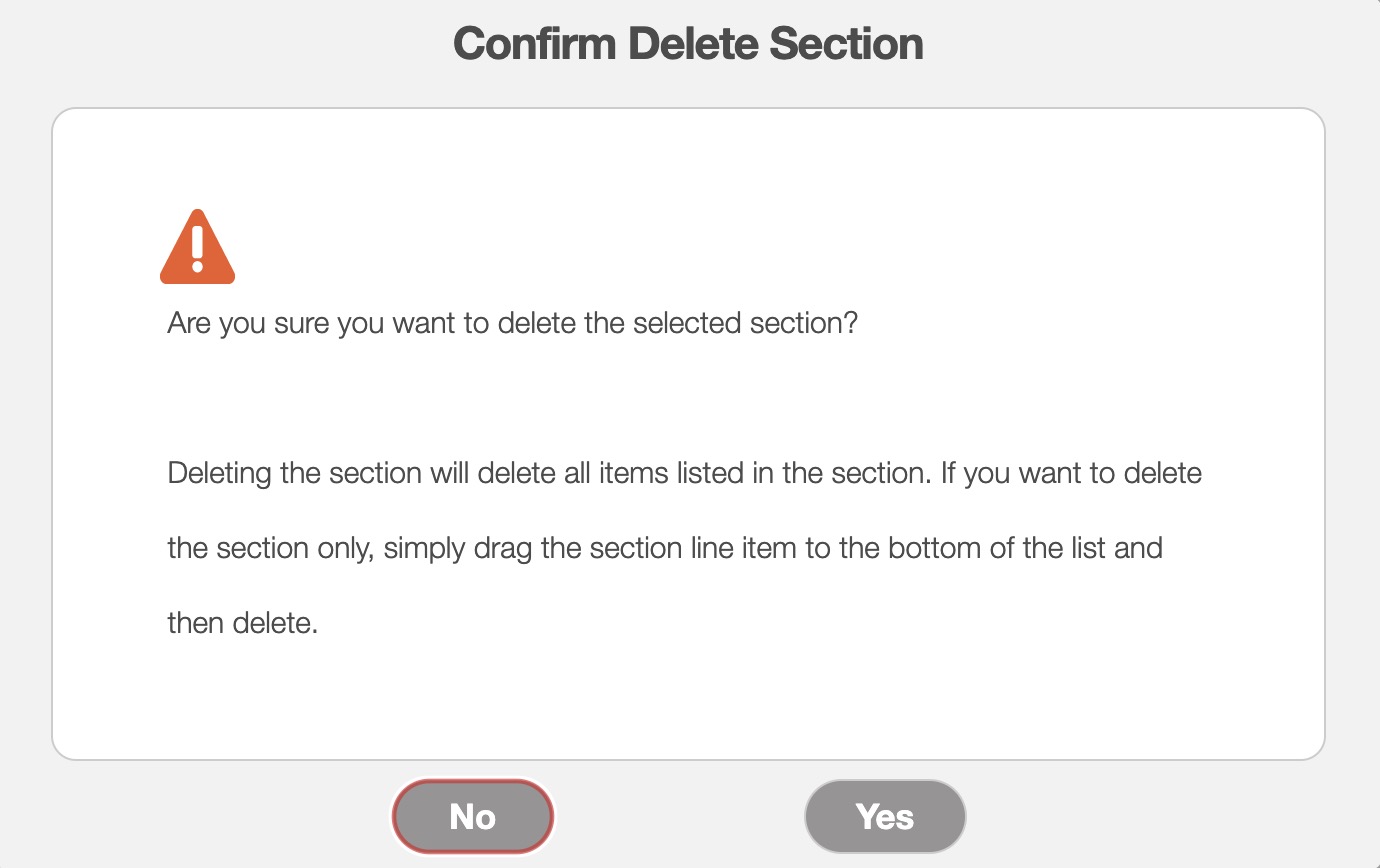 Click the Yes button to confirm you would like to delete the selected section. Please note that any parts or services that are listed under the section will also be removed.