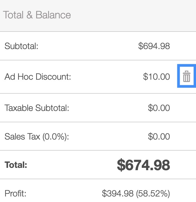 In the "Total & Balance" panel, locate the discount you would like to delete. Click on the corresponding Trash Can button next to the selected discount: