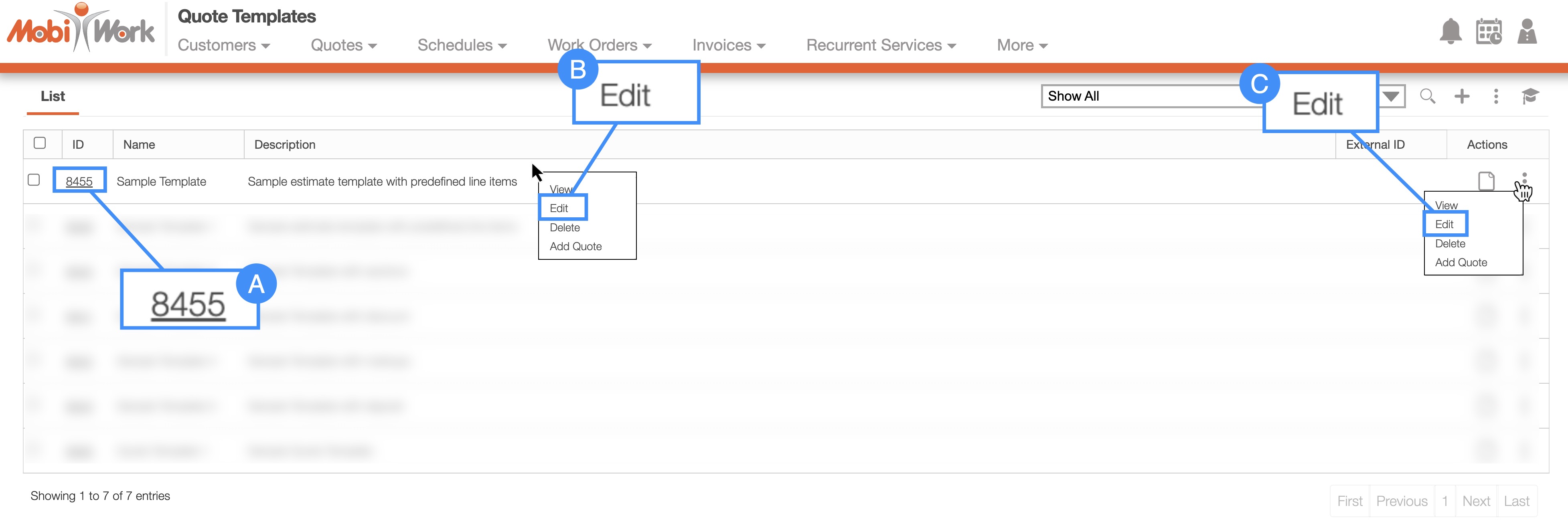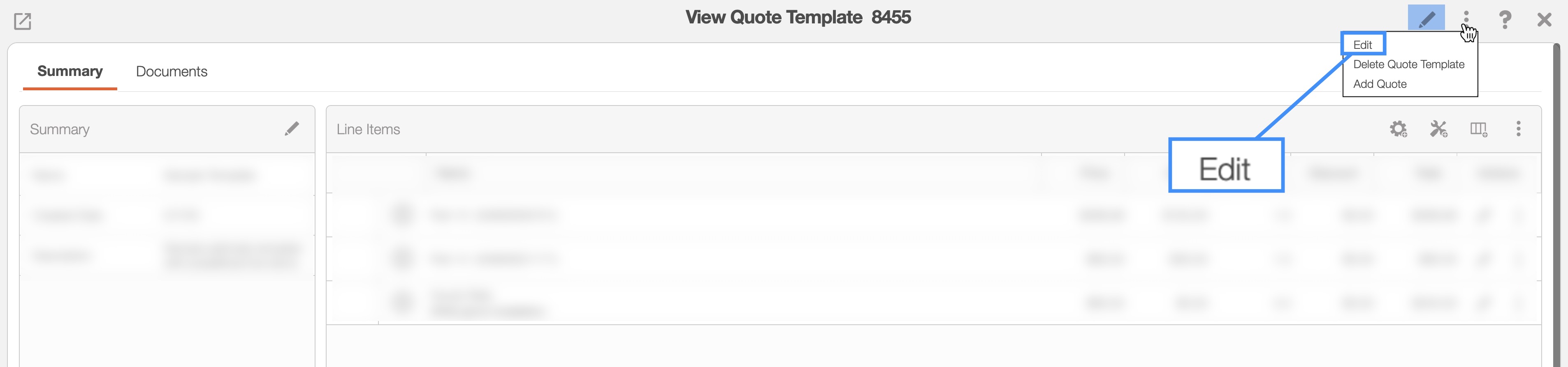- By clicking on the desired quote template ID and from the View Quote Template pop-up window select either the Pencil icon or the Individual Actions button: