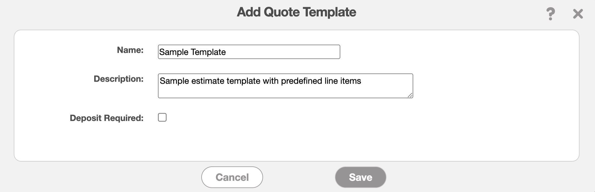 From this window, input the new name and description for the quote template or update the deposit amount if required.