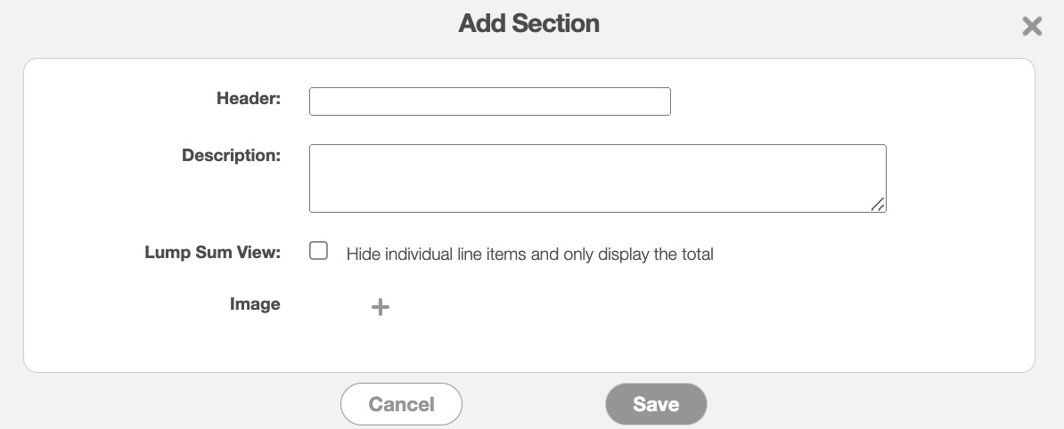 Lump Sum View- By clicking on the lump sum view for the Add Section pop-up window, you will be able to hide the individual line items for the items listed in the specified section. This option is different from the "Lump Sum View" checkbox in the Add Recurrent Invoice pop-up window and the Edit Recurrent Invoice pop-up window; this lump sum view will apply to the entire recurrent invoice.