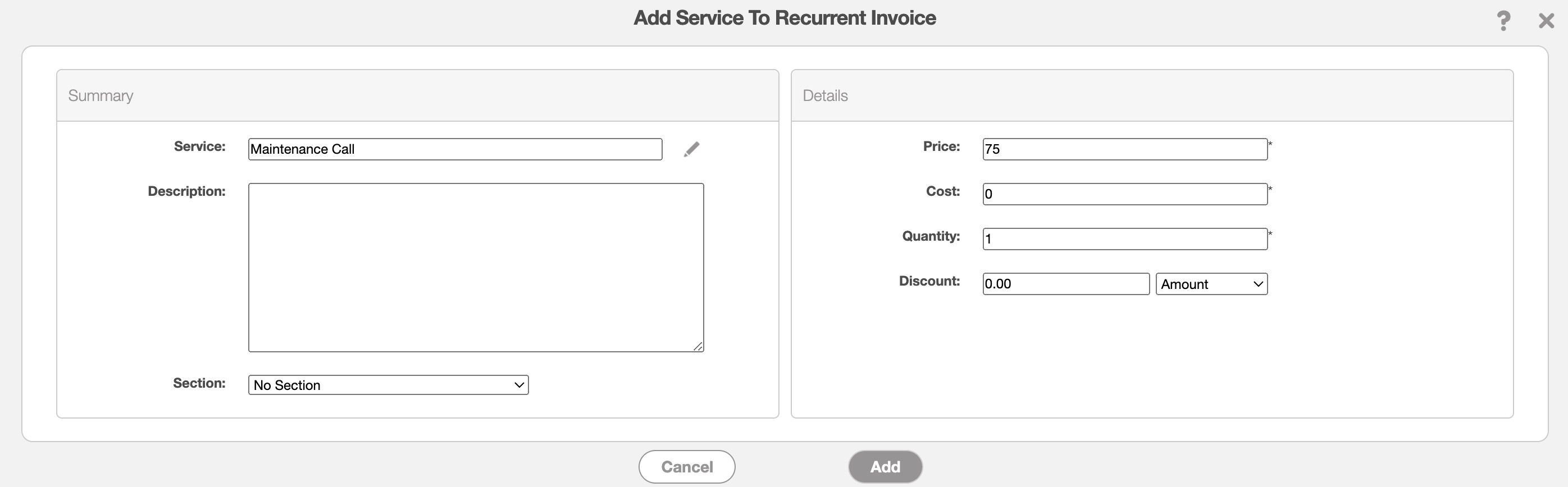After selecting a service from the Select Service pop-up window, the Add Service to Recurrent Invoice pop-up window will appear, allowing you to adjust the quantity, section, and other details: