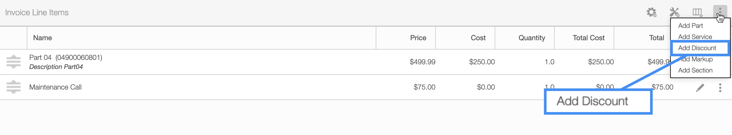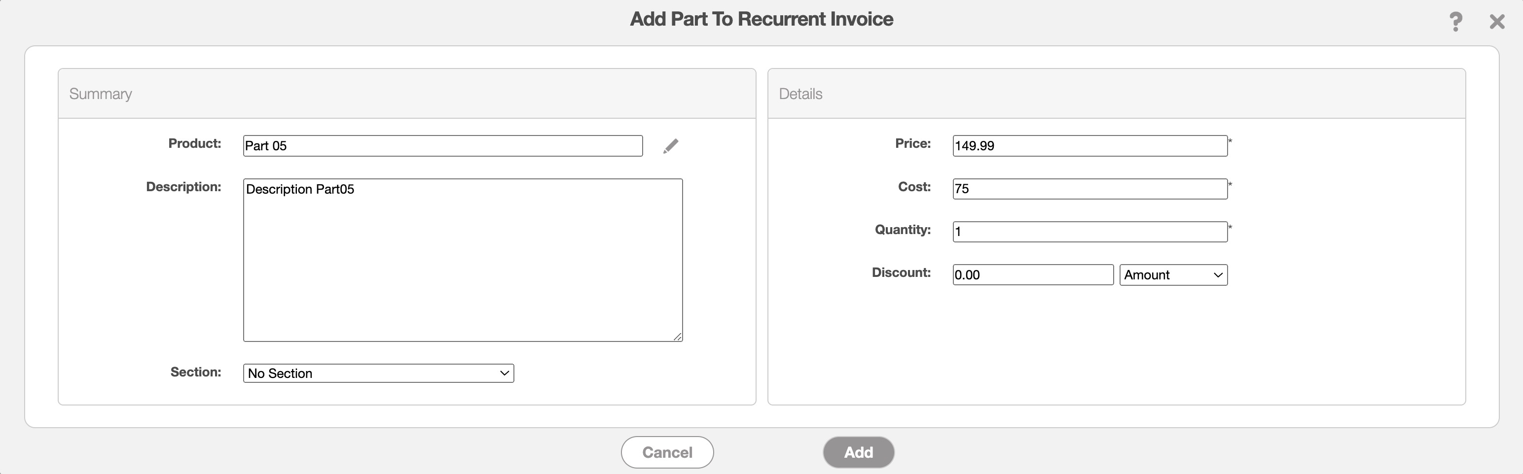 Once you have created a new recurrent invoice, it is time to populate it with the required parts and services. You can also add discounts and markups as well as sections to help separate the recurrent invoice items for clearer organization.