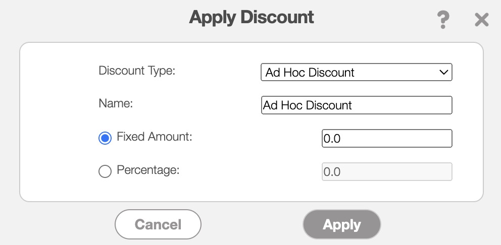 Once you click on the "Add Discount" option, the Apply Discount pop-up window will appear: