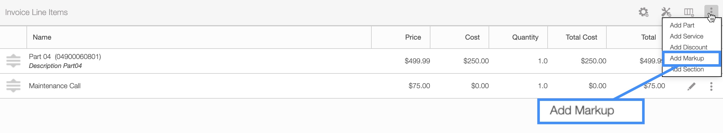 In the "Line Items" panel click on the Individual Actions in the top-right. From the drop-down menu that appears, select the "Add Markup" option.