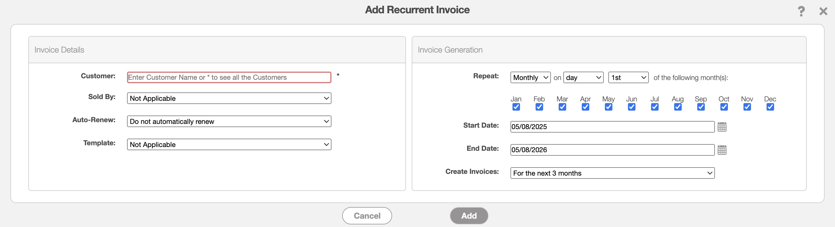 From the Add Recurrent Invoice pop-up window, you can also input the following: