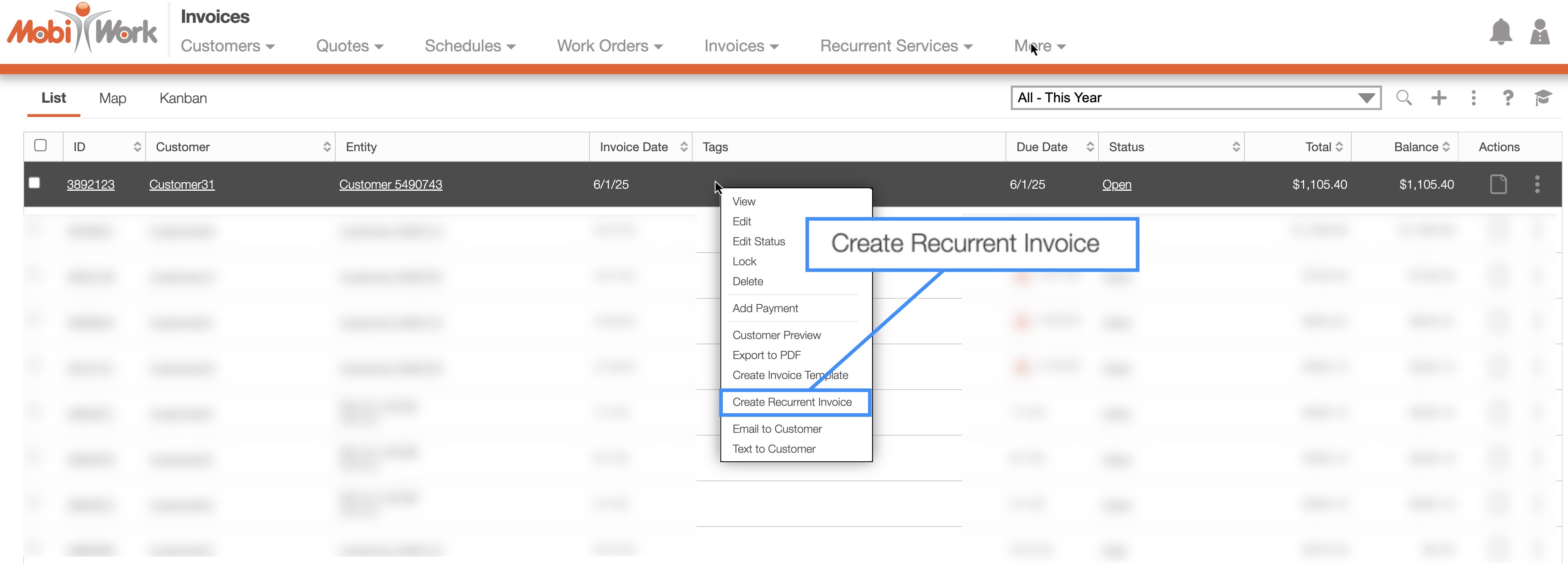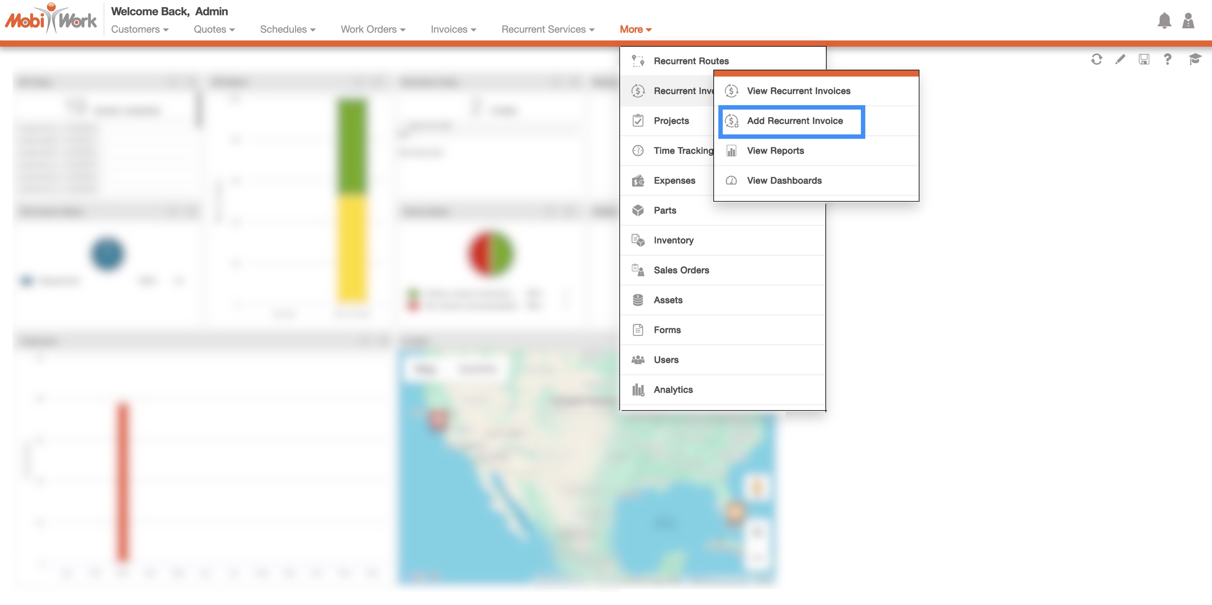 - Hover over the Recurrent Invoice feature from your MobiWork menu: