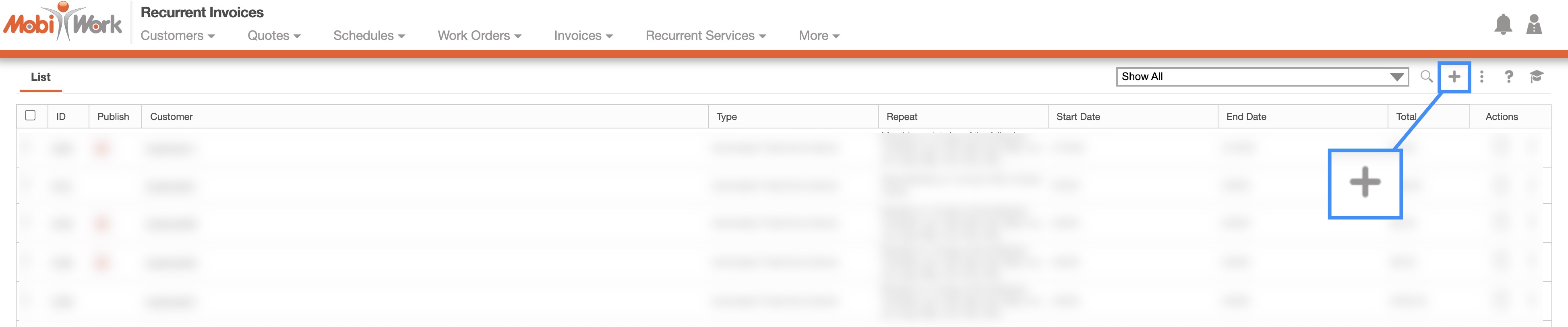 There are a couple of ways you can add a recurrent invoice into MobiWork. You can add an invoice through the Recurrent Invoice List page, on the Recurrent Services pop-up window, or even by converting an invoice. The subsections below will go into further detail about the different ways you can add a new recurrent invoice.