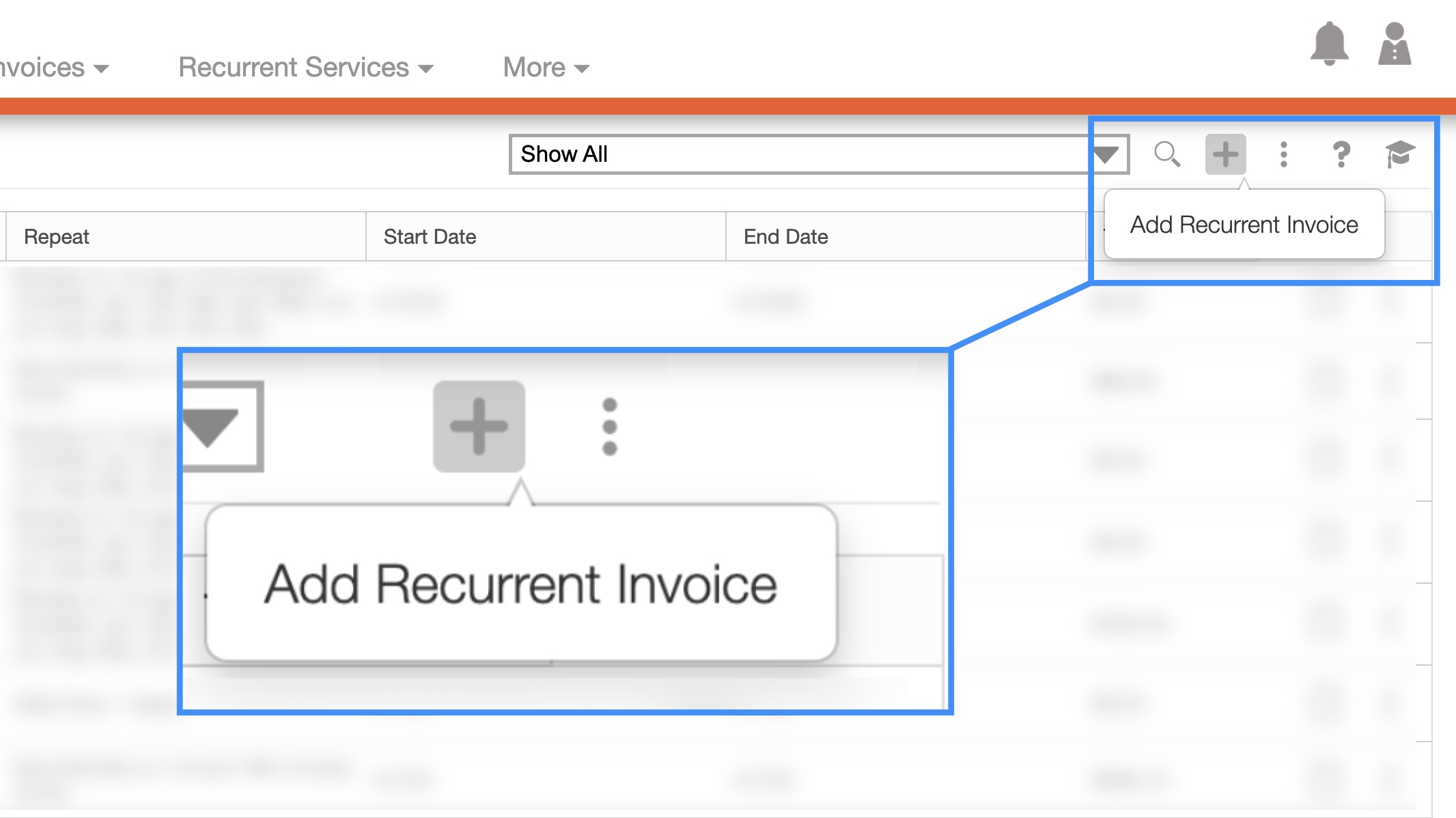 Likewise, you create a recurrent invoice directly from the View Invoice pop-up window. The video below will showcase how to create a recurrent invoice from the View Invoice pop-up window: