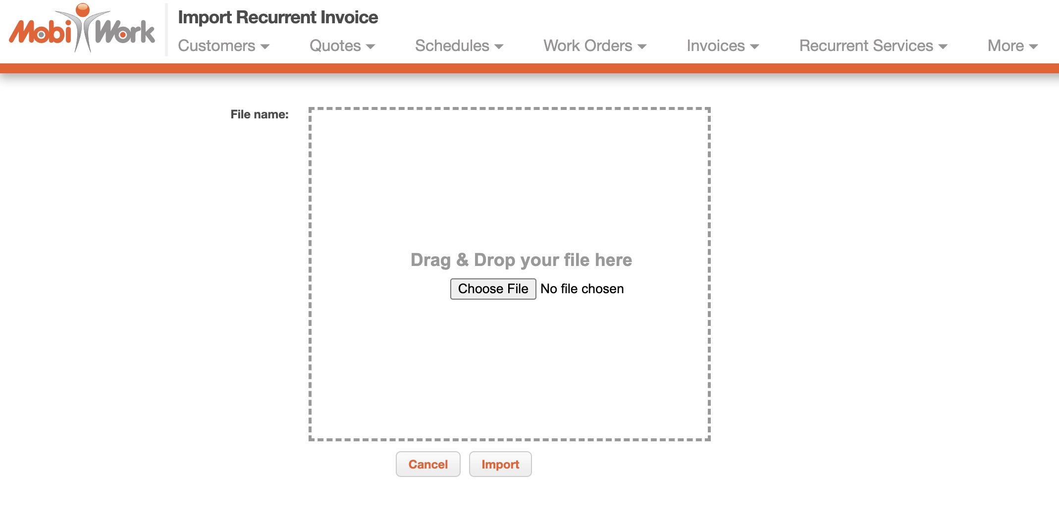 Once you have entered the recurrent invoices in the Excel document correctly, you can upload that document to MobiWork:
