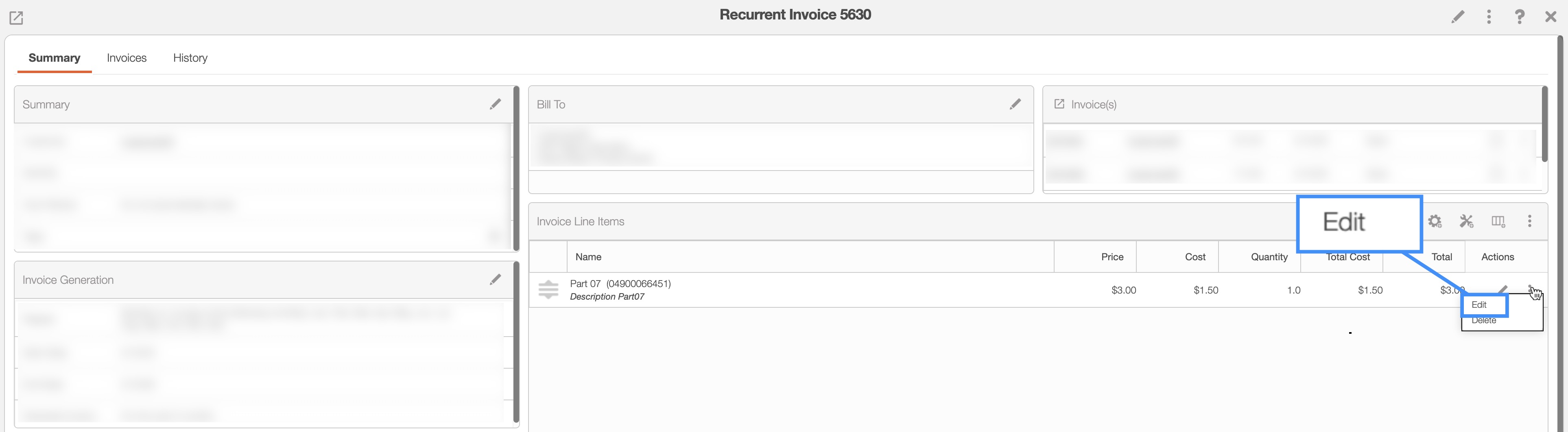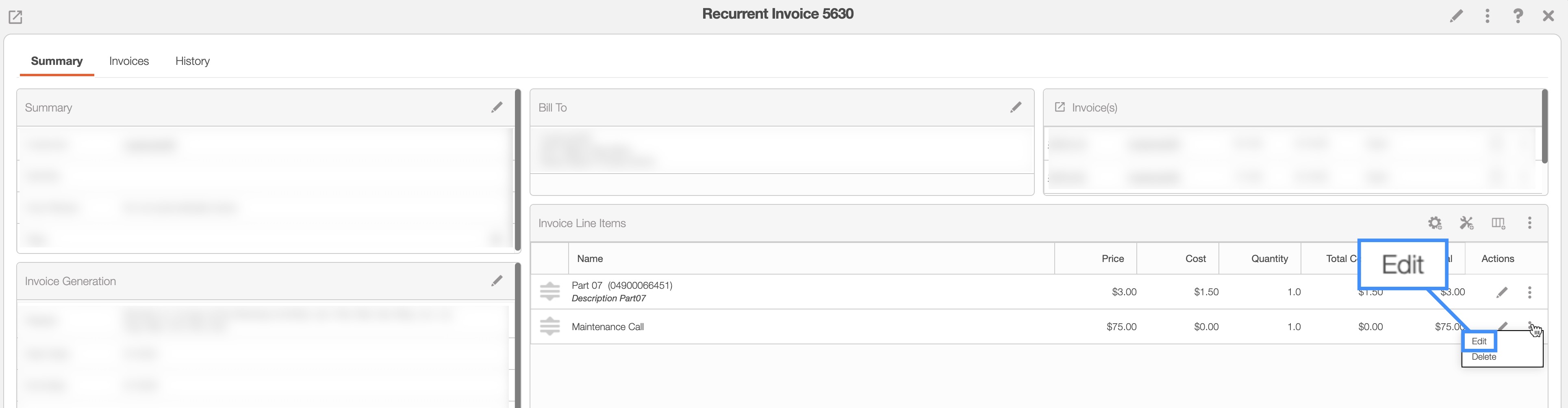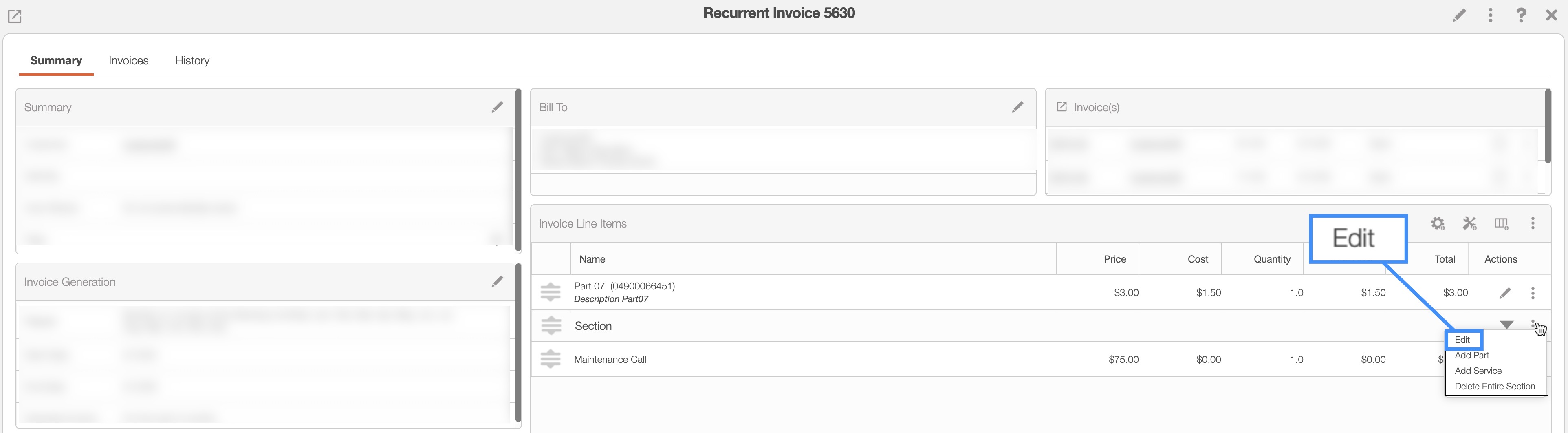 You will be able to edit the parts, services, and sections listed in the recurrent invoice's line items. The following subsections will illustrate how to edit these different line item entries.