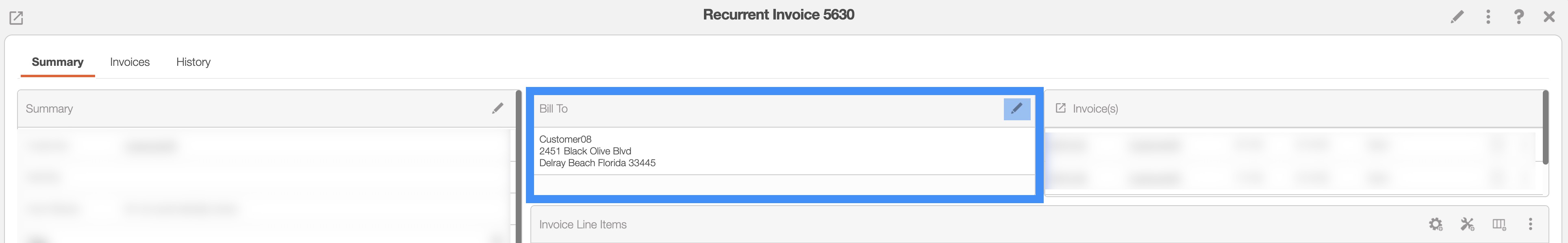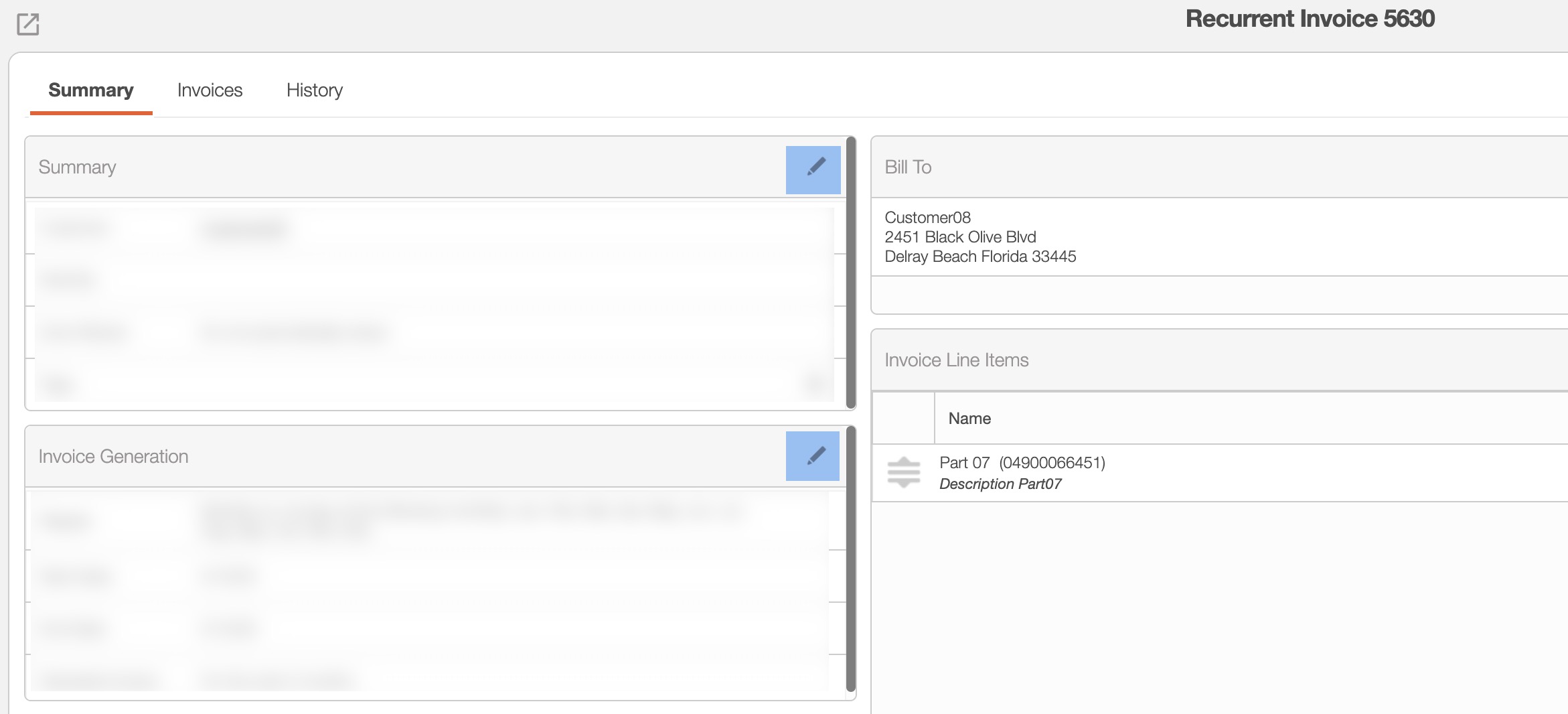 - You can also acccess the Recurrent Invoice pop-up window by clicking on the Pencil icon from the "Summary" or "Invoice Generation" panels: