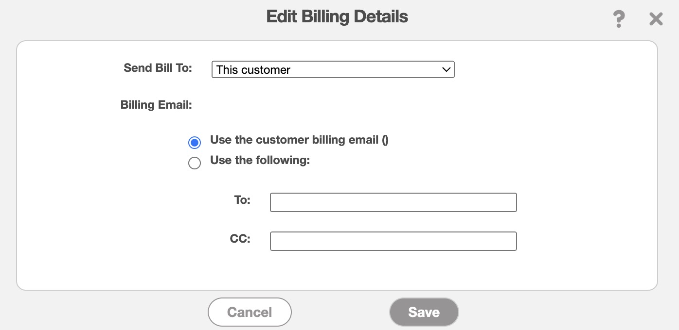 The Edit Billing Details pop-up window will then appear. In this window, you can select who recieves the bill for the recurrent invoice. The choices are defined below: