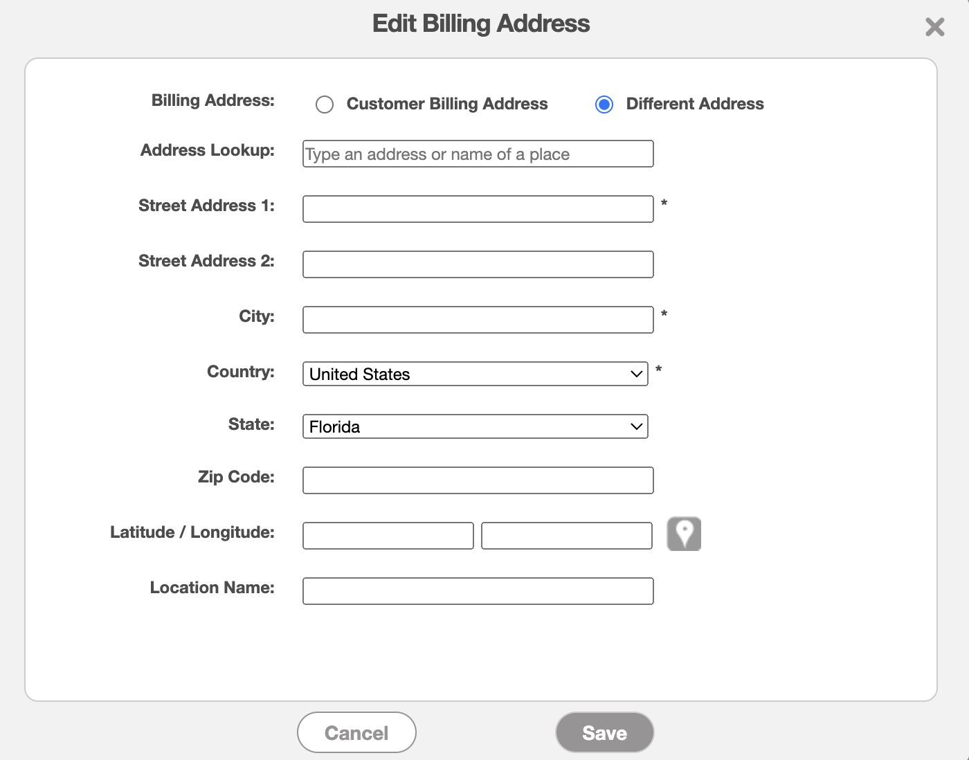 The Edit Billing Address pop-up window will then appear; you can choose to use the "Customer Billing Address" or a "Different Address:"